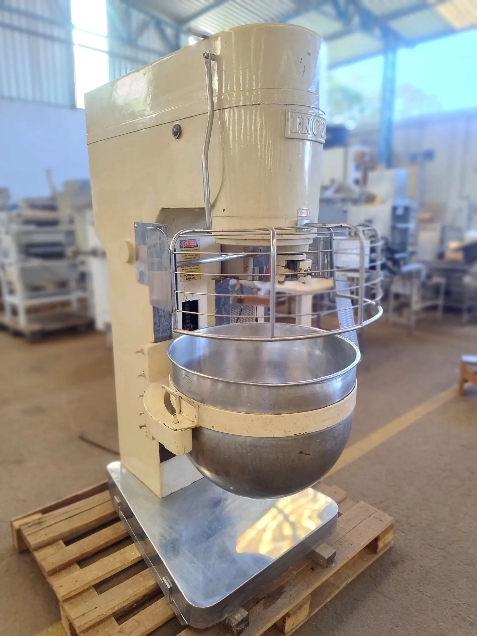 Batedeira planetária capacidade 130 litros marca Inco. Equipamento com batedor globo, tacho em aço inox e quadro elétrico novos. Câmbio de 4 velocidades e motor de 5 CV.