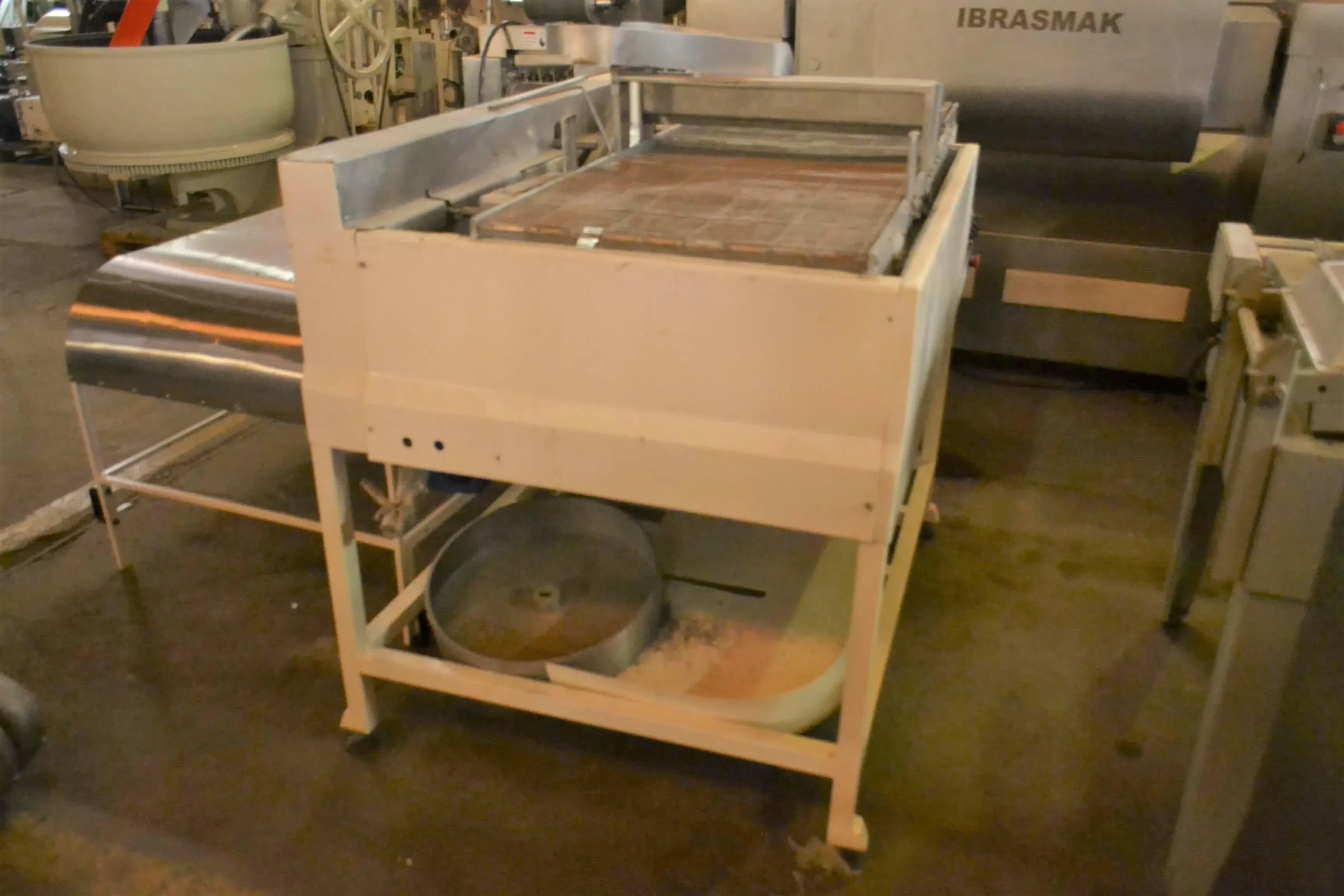 Cobrideira de chocolates 600 mm Águiatech. Modelo: Cobrimaq 60. Equipamento com 1.75 m de comprimento e 600 mm de largura, composto de esteira metálica, sistema de vibração e aquecimento e soprador. Equipamento novo, sem uso.