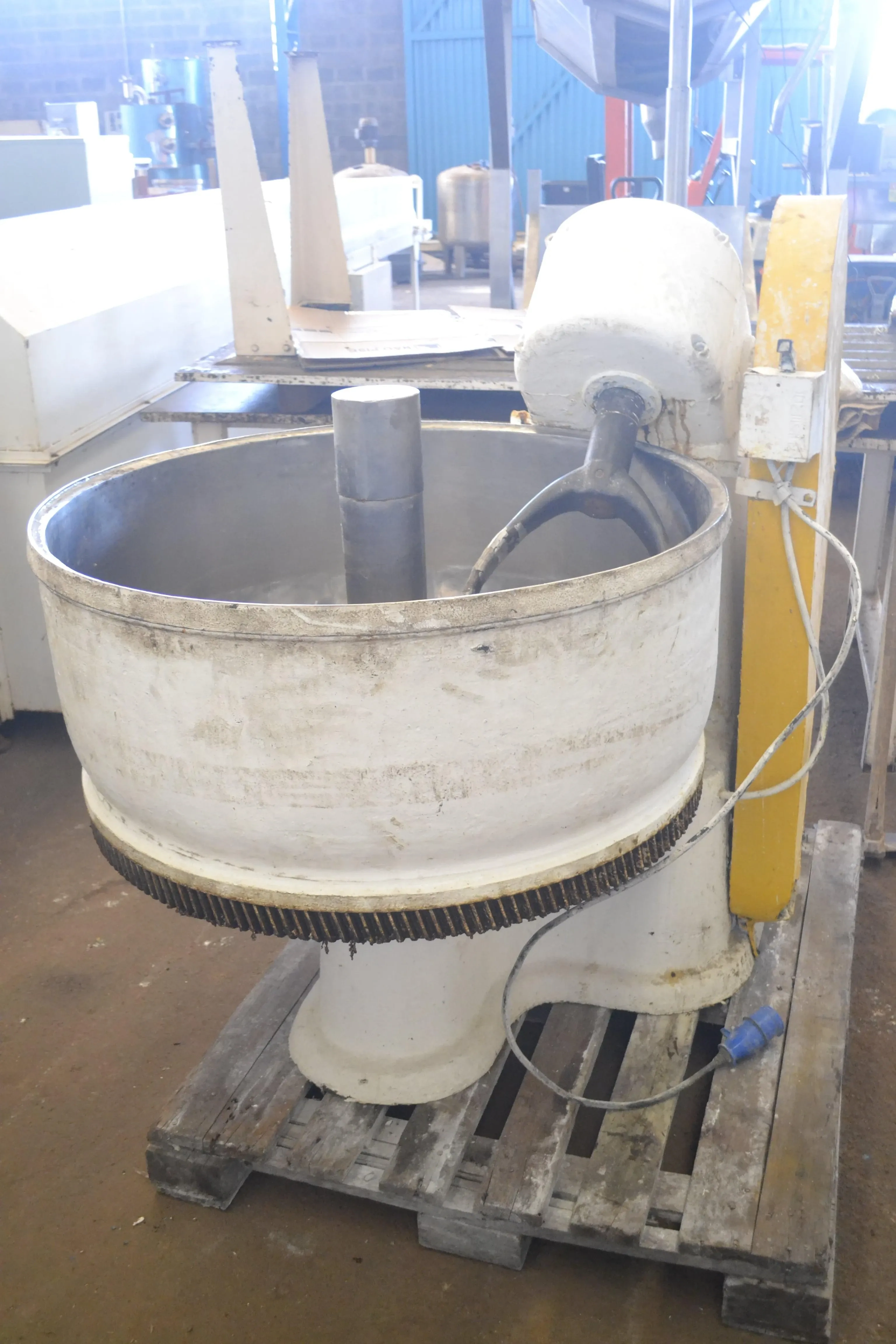 Amassadeira capacidade 300 litros. Equipamento em aço carbono, com bojo revestido em aço inox, e batedor tipo gancho. Dimensões: - diâmetro: 950 mm - altura: 450 mm - largura: 1,45 m - altura total: 1,25 m