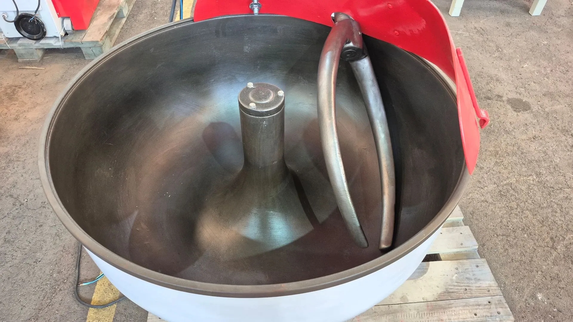 Amassadeira em aço carbono, com batedor tipo gancho capacidade aproximada 100 litros. Equipamento com uma velocidade. Motor 220 V trifásico, 2 CV, 1720 RPM.