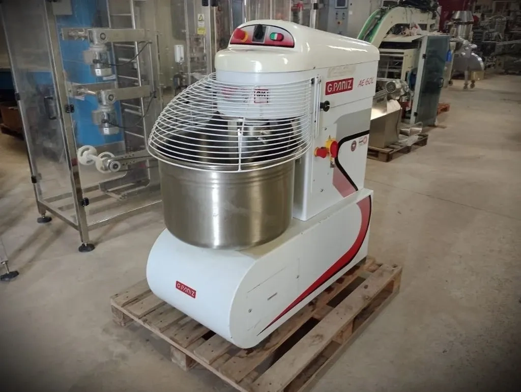 Amassadeira masseira com batedor tipo espiral capacidade 60 litros marca G. Paniz modelo AE 60l. Com bojo em aço inox e estrutura em epóxi. Tensão trifásico 220 V, frequência 60 Hz, ano de fabricação 2013. Peso bruto 290 kg.