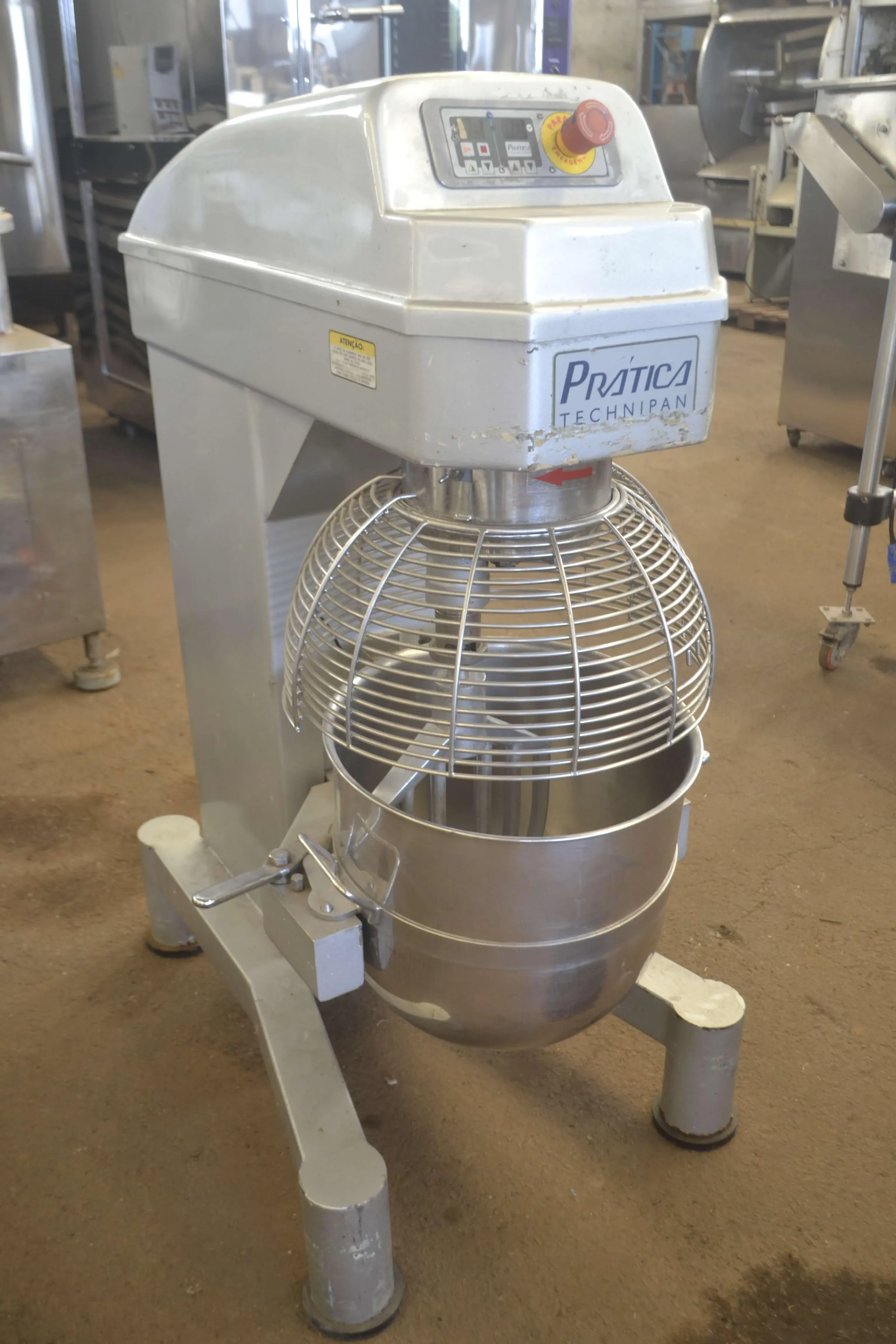 Batedeira Planetária 36 litros marca Prática. Modelo BP36. Ideal para fabricação de produtos de confeitaria (massas leves, pastosas e líquidas). Permite programar eletronicamente o tempo de mistura e os 10 níveis de velocidades. Equipada com grade de segurança, tacho em aço inoxidável removível e três tipos de batedores intercambiáveis: Globo, leque e gancho. Higienização - design moderno e dentro de conceitos que facilitam a limpeza. Equipamento produzido com componentes de segurança conforme Norma Regulamentadora NR-12.