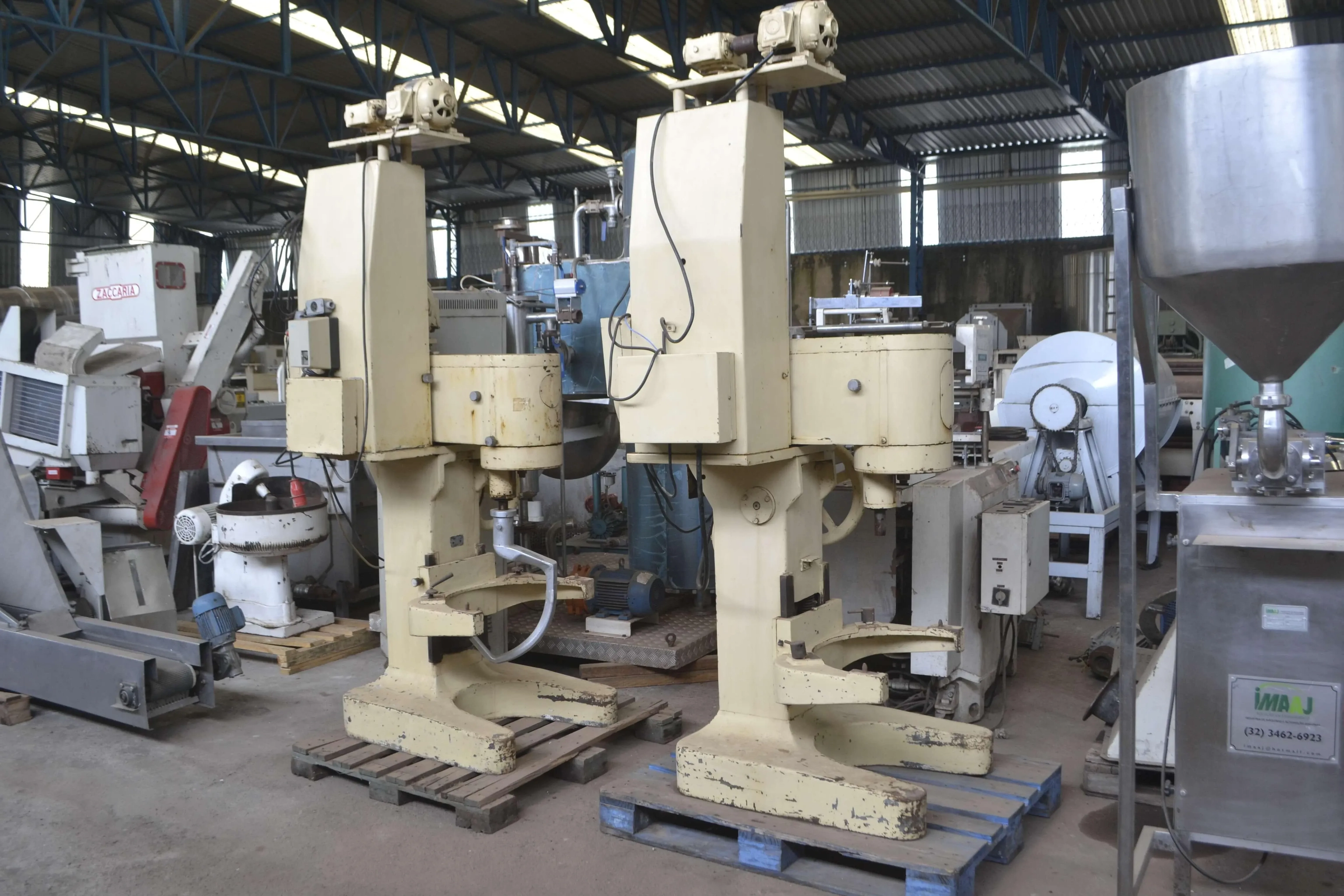 Batedeira capacidade 100 litros marca Amadio. Duas unidades com 2 tachos com rodízios cada. Acompanham batedores gancho e globo. Duas Batedeiras disponíveis.