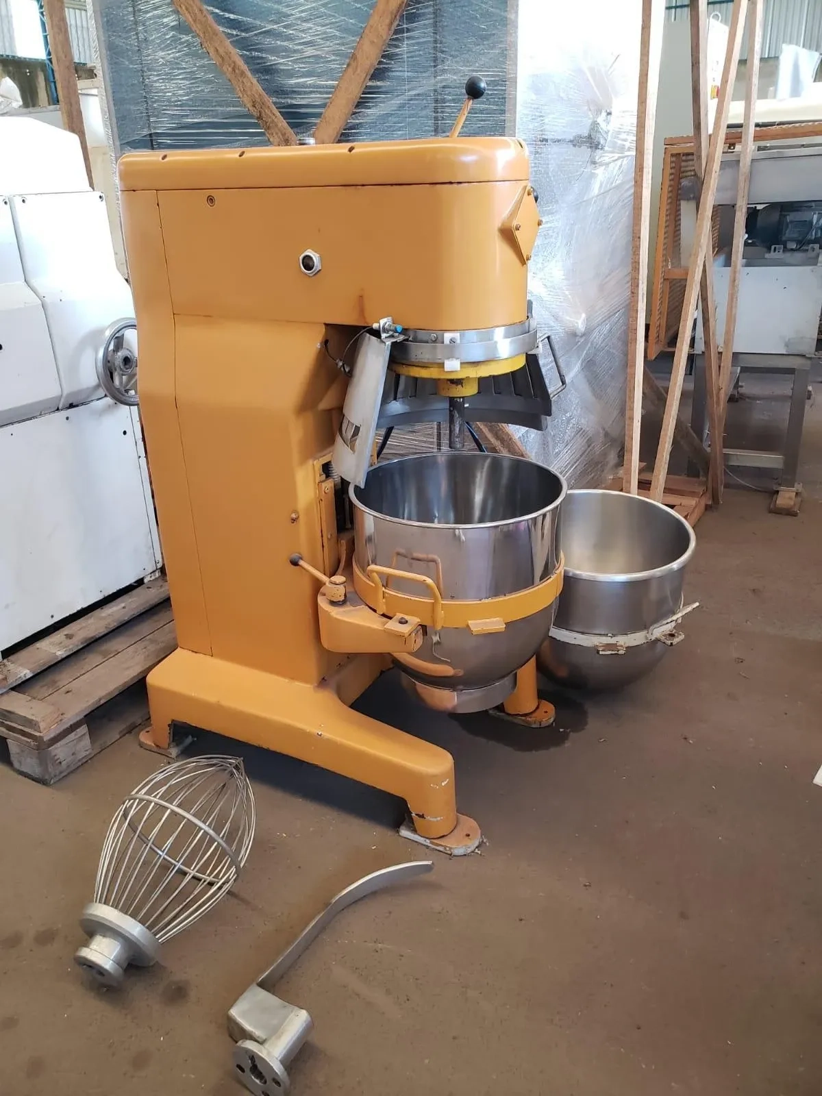 Batedeira capacidade 30 l. Equipamento com 3 velocidades e tacho e batedores (gancho, raquete, globo) em aço inox. Monofásica 220 v. Equipamento de origem chinesa (novo).