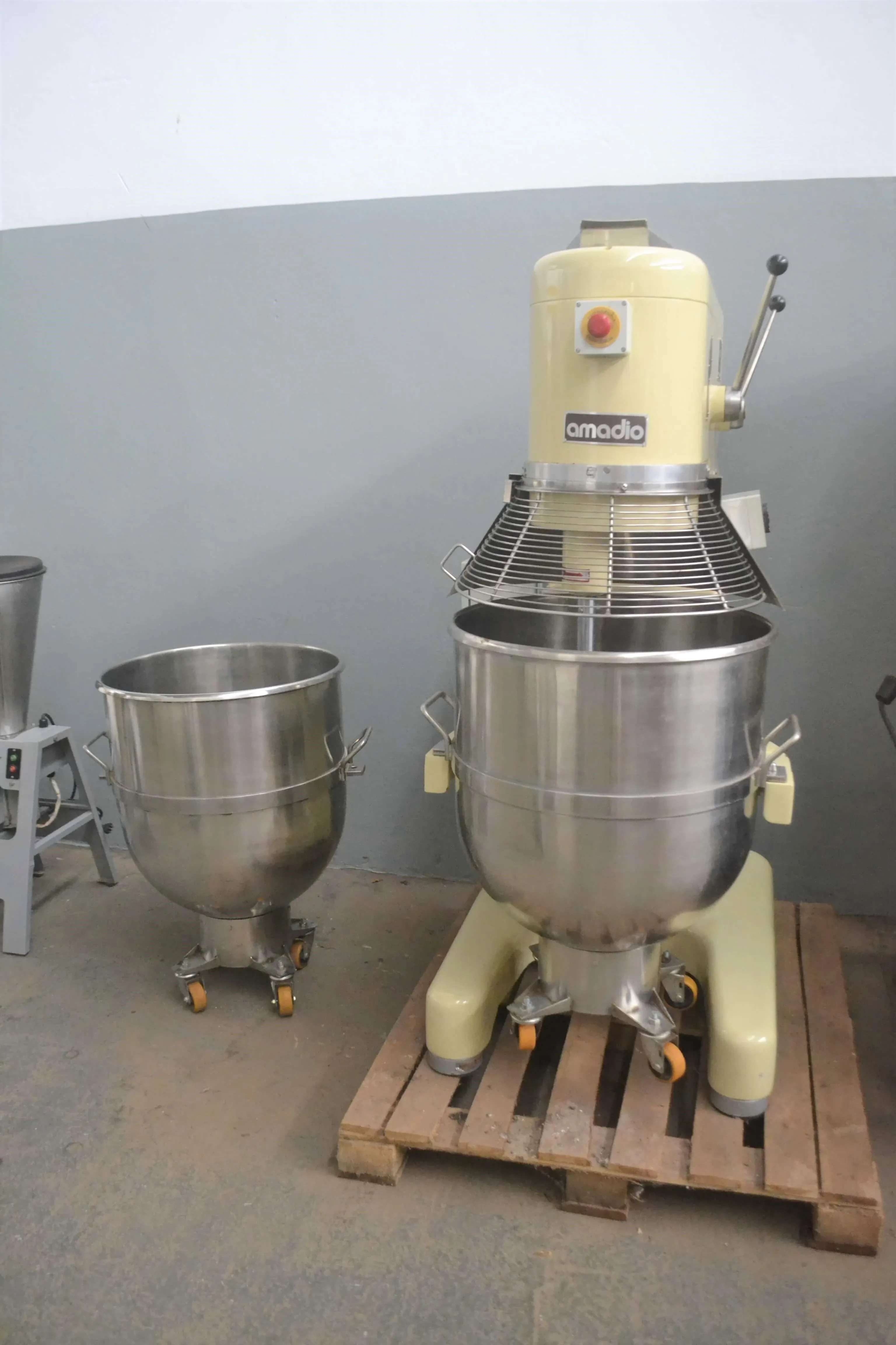 Batedeira planetária capacidade 130 litros marca Amadio. Modelo: 130 LAS. Equipamento com 4 velocidades de operação (1ª: 95, 2ª: 150, 3ª: 245 e 4ª: 400 RPM), construído em aço cromo níquel, cementado, temperado e retificado para trabalho com óleo lubrificante. Com quadro de comando composto de botões liga/desliga, desbloqueio, botões de acionamento do sistema de movimentação do suporte do recipiente, sinaleiros indicativos de quadro energizado, batedeira em funcionamento, bloqueio e suporte.