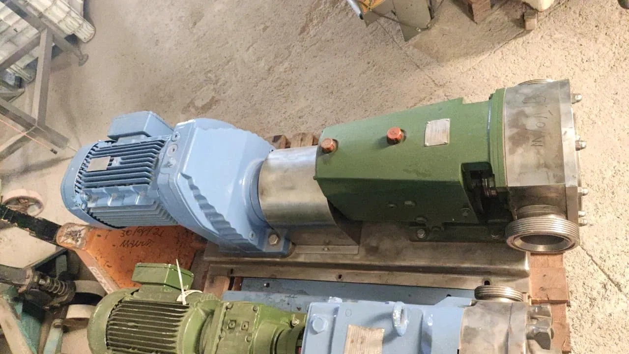 Bomba de lóbulos em aço inox 316 marca Alfa Laval modelo SRU5/ 168/ LS. Motor 11 kW. Ano de fabricação 2011. Diâmetro interno entrada/ saída de produto aproximadamente 78 mm. Teste positivo para reagente inox 316. Bomba montada no skid suporte em aço inox, com motor e redutor. Marca do fabricante dos motores SEW.