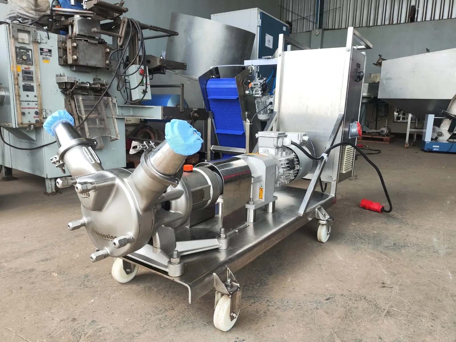 Bomba senoidal positiva em aço inox 316 marca MasoSine Watson Marlow. Tipo/ modelo C 300-CFG002281. Bomba de rotor senoidal e deslocamento positivo. Equipamento asséptico anti explosão ex Atex classificações FDA. Ano de fabricação 2020. Origem Alemanha. Motor marca Nord. Alimentação 380 V. Trifásico.