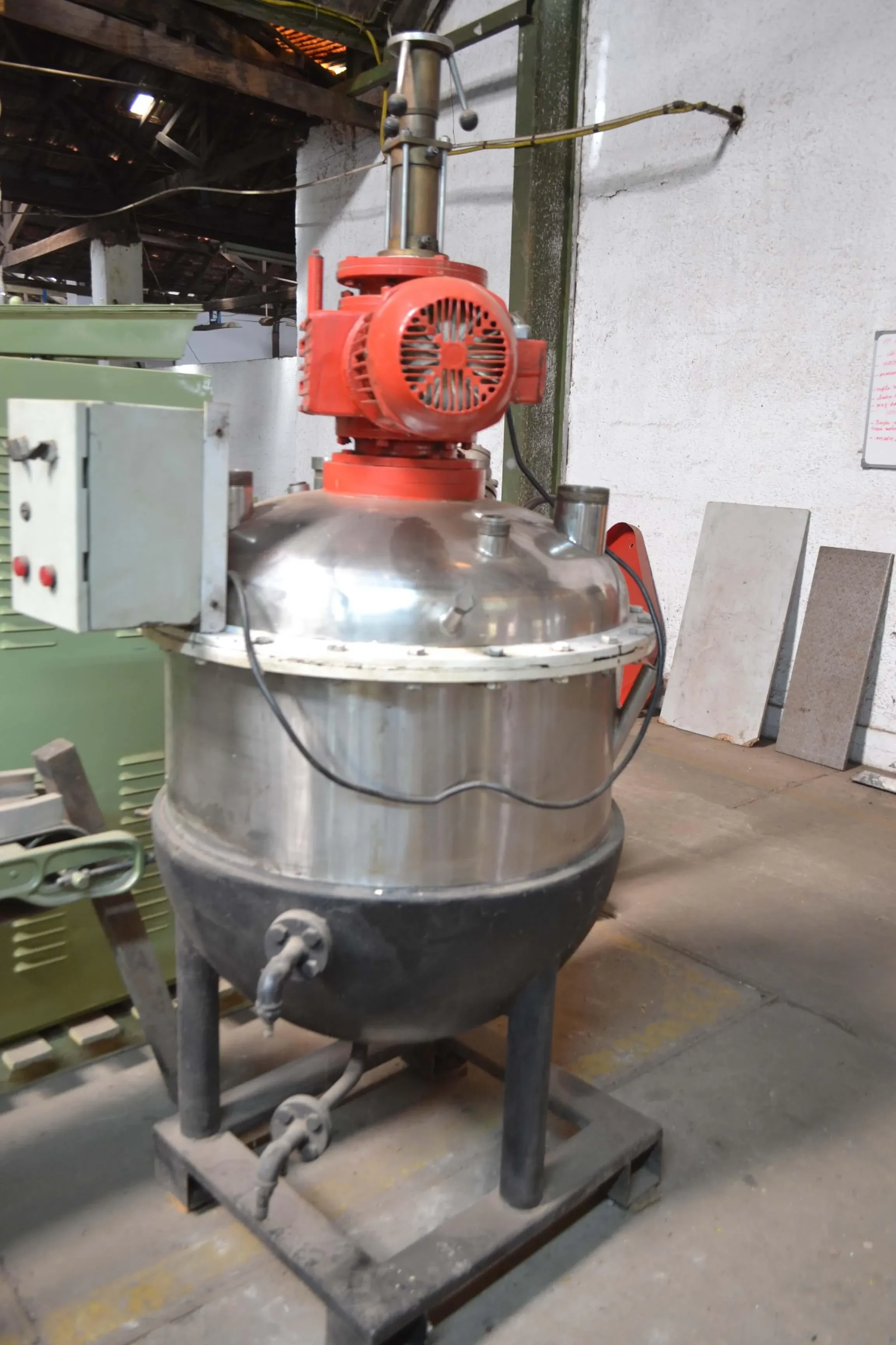 Equipamento em aço inox, encamisado ('meia cana') com camisa externa em aço carbono.