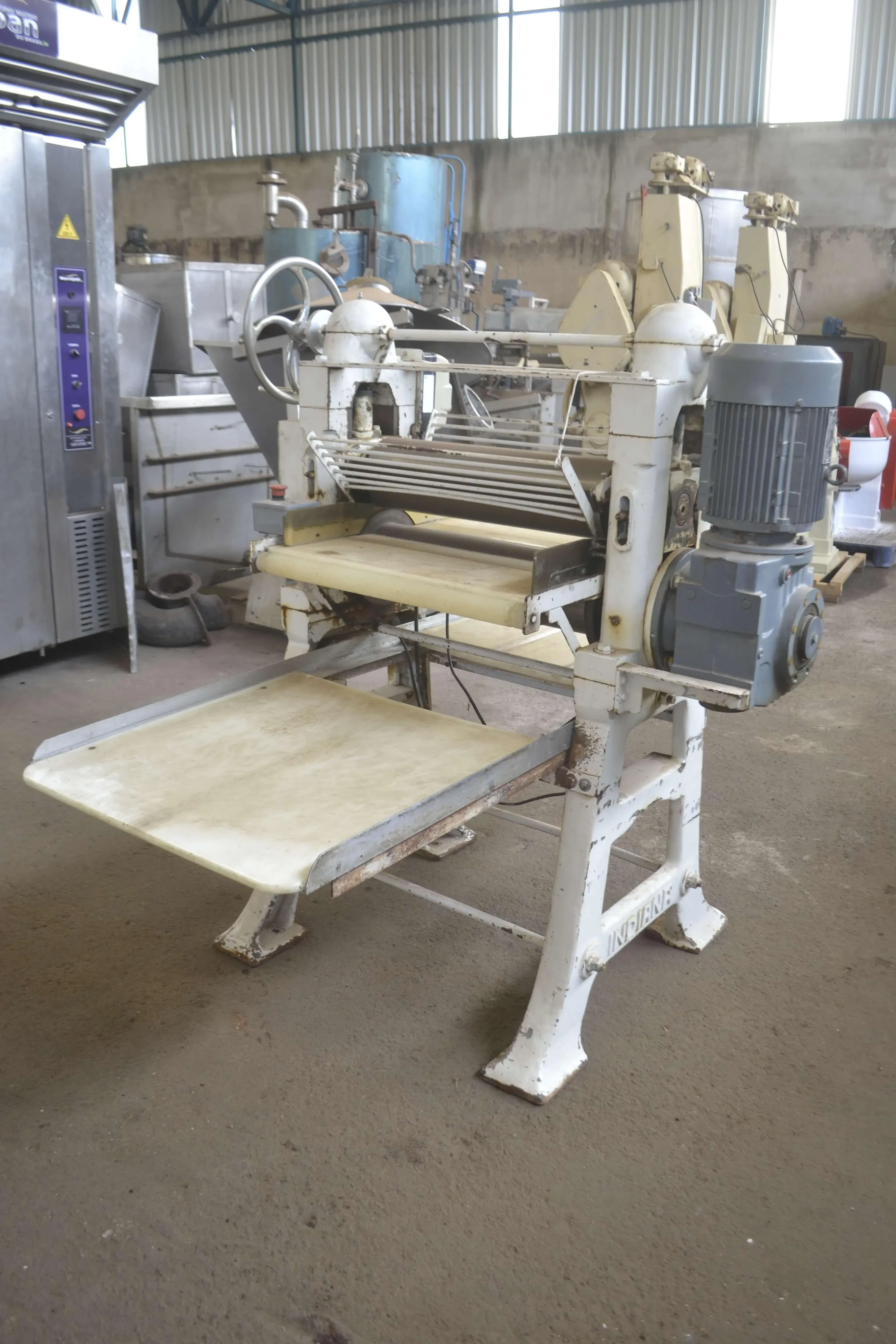 Cilindro 600 mm marca Indiana. Modelo: Super. Capacidade: 200 Kg/hora. Indicado para laminação de massas como pastel e lasanha, possui dois rolos maciços apoiados sobre rolamentos, com engrenagens helicoidais imersas em banho de óleo. Com grades em aço inoxidável, botoeiras, chaves magnéticas de acionamento e bandejas em polipropileno.