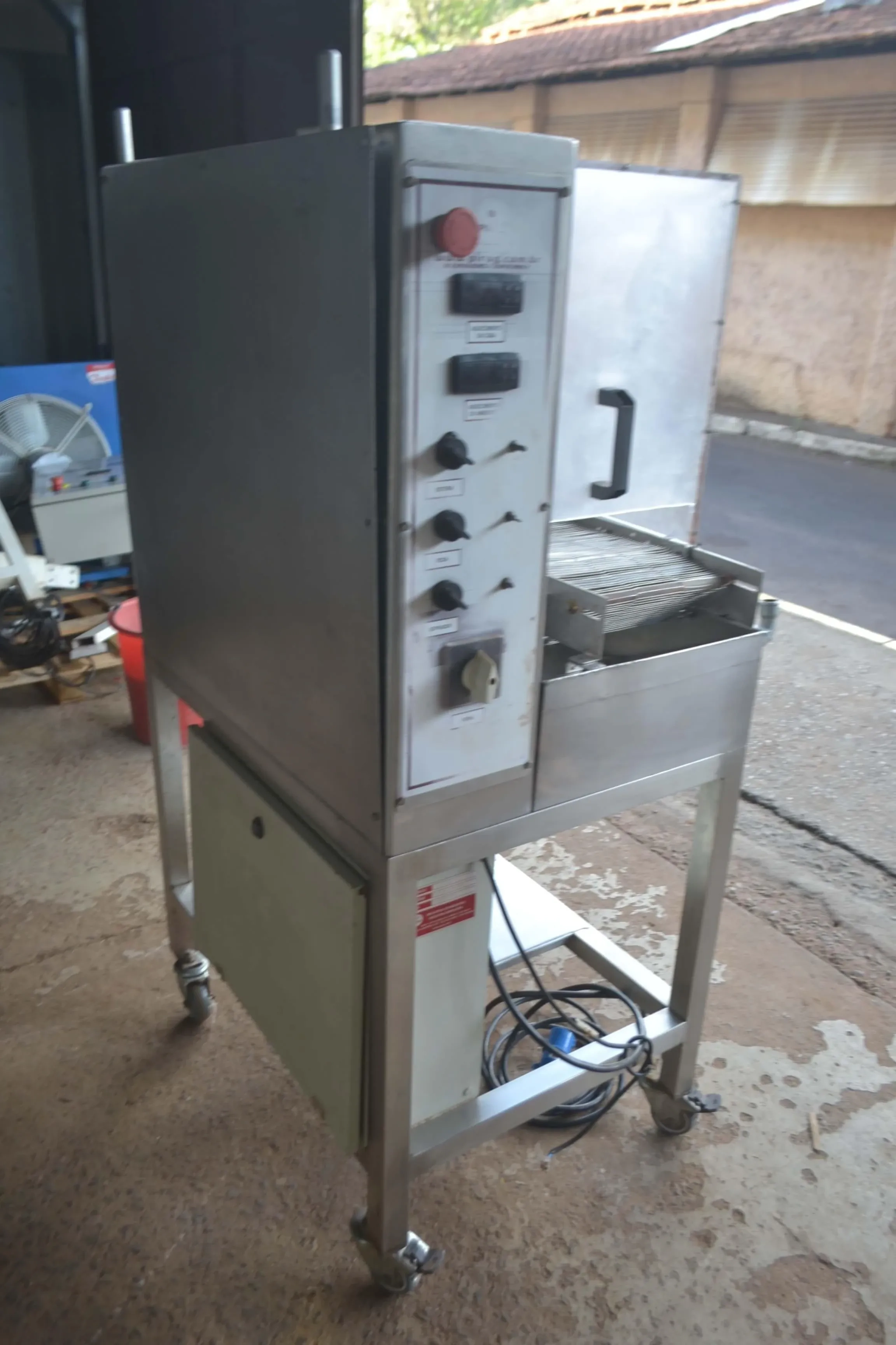 Cobrideira de chocolates 250 mm marca Piróg. Modelo: MC/250. Equipamento com estrutura em aço inox e cobertura com capota em policarbonato. Com sistema de aquecimento por meio de resistência e controle digital de temperatura. Painel elétrico instalado na parte inferior para melhor acesso/manutenção.