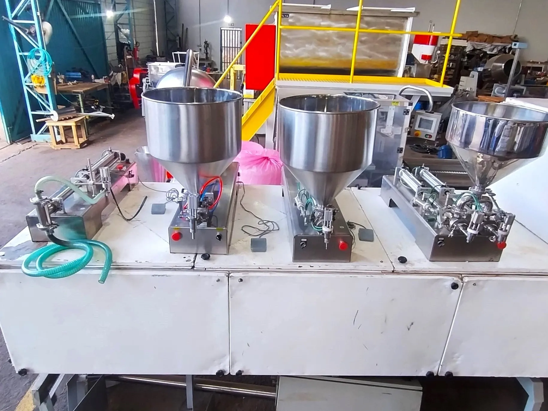 Conjunto composto por 4 diferentes envasadoras de bancada para líquidos e/ ou viscosos. Com diferentes capacidades de produção e faixas de dosagem. Equipamentos em aço inox, para dosagem de produtos em frascos, potes, tubos, garrafas, entre outros, de fácil operação e ajuste de dosagem. Com dosagens acionadas de forma automática ou por comando de pedal, possuem bicos de enchimento com sistema de anti-gotejamento (corta gota). Equipamentos novos, sem uso. Origem China.
