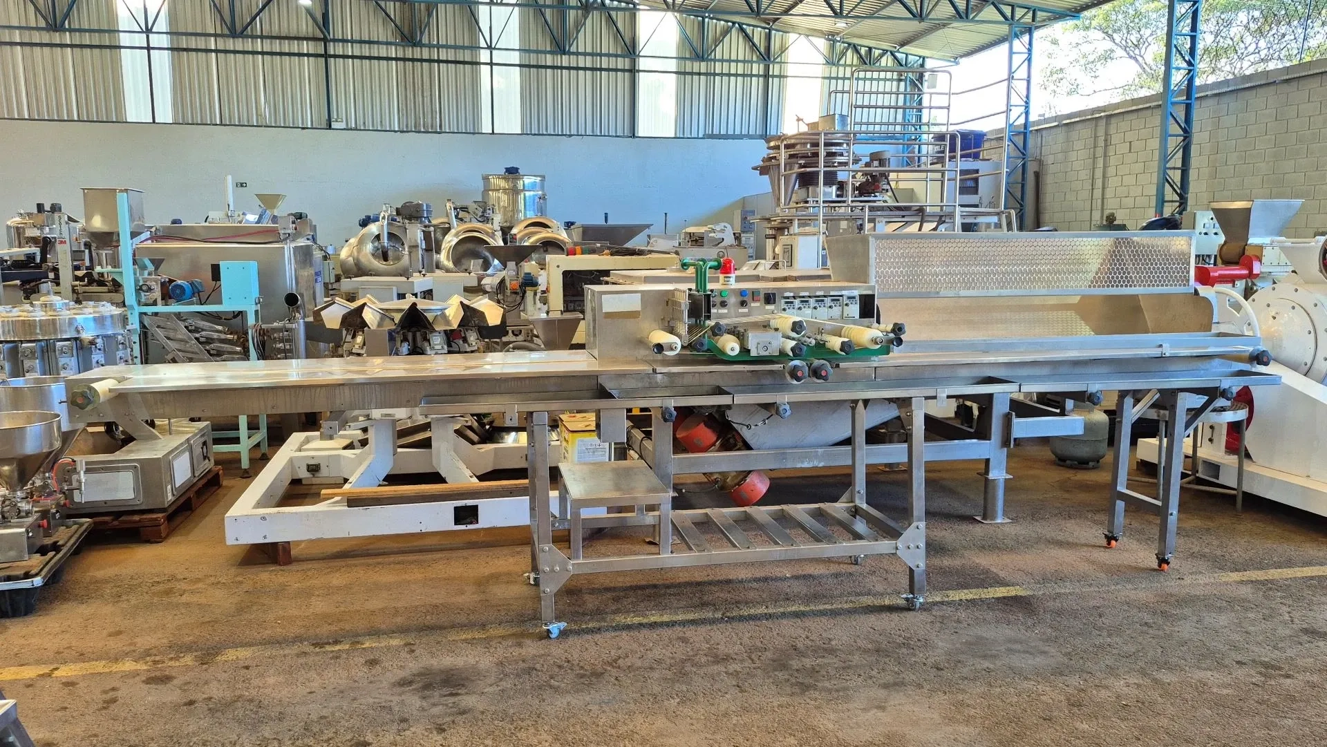 Cortadora e recheadora de pão de alho baguete e bolinha marca máquinas DOM. Produção de 5600 baguetes ou 12.000 bolinhas por hora. Em aço inox total, o equipamento acompanha reservatório de recheio. Quadro elétrico com controle de velocidade das facas, bicos e esteira.