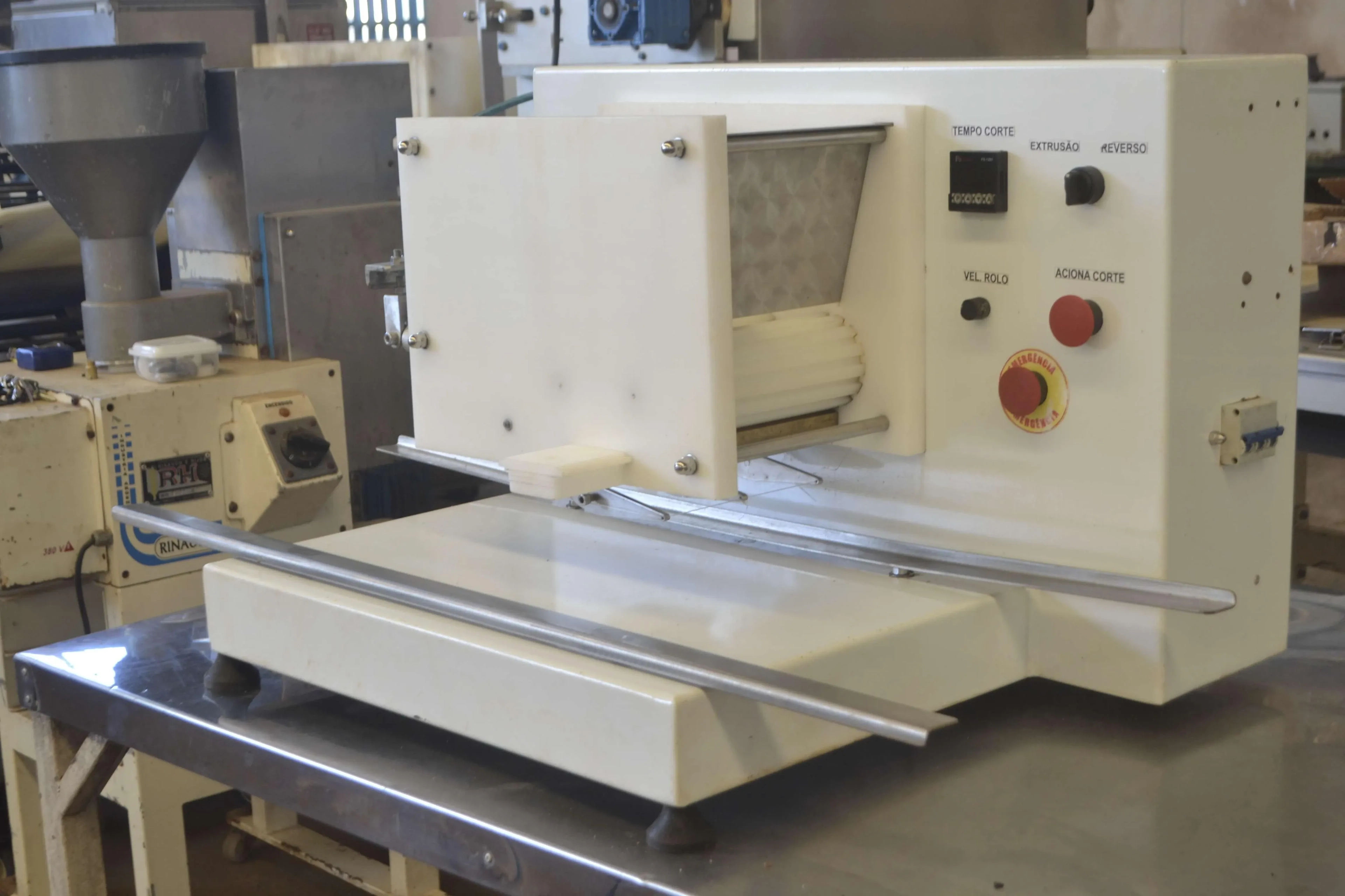 Corte de arame/roseteira capacidade 60 Kg/h marca Wandder, modelo E-60. Equipamento de corte à fio para fabricação de biscoitos amanteigados e nata, pães de queijo e outros. Máquina pneumática, semiautomática. Voltagem: trifásica 380 v.