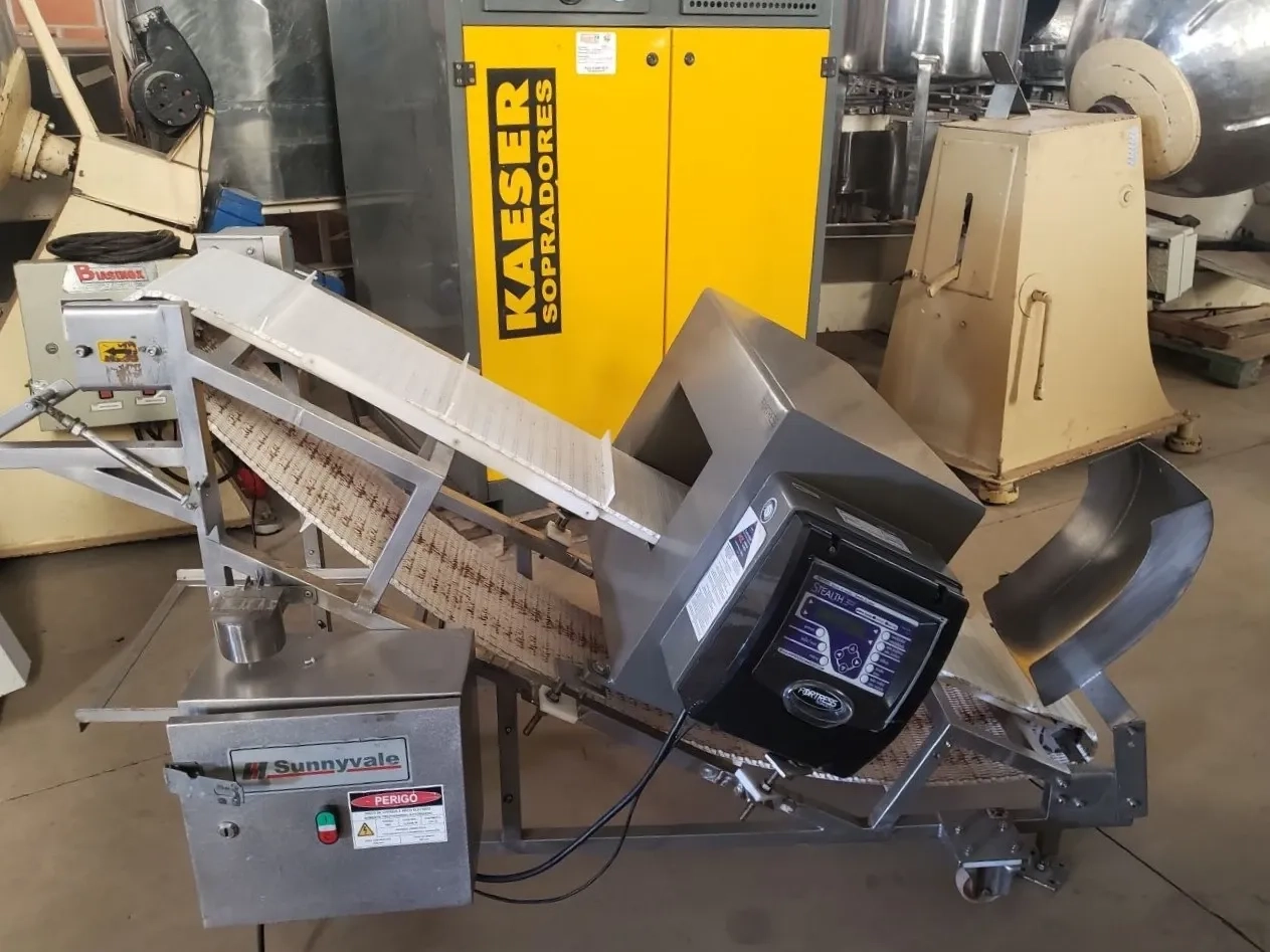 Detector de metais inclinado marca Fortress. Modelo do túnel 13" x 8" stealth. Medidas aproximadas da boca altura 155 mm x largura 320 mm. Esteira transportadora marca Sunnyvale modelo ETT 1600X300. Foi realizado o relatório técnico em 13/06/2024. Foi efetuado a ação preventiva para baixar o valor do balance e teste com os corpos de prova 2 mm ferroso, não ferroso e aço inoxidável. Foi inserida placa Serach Head.