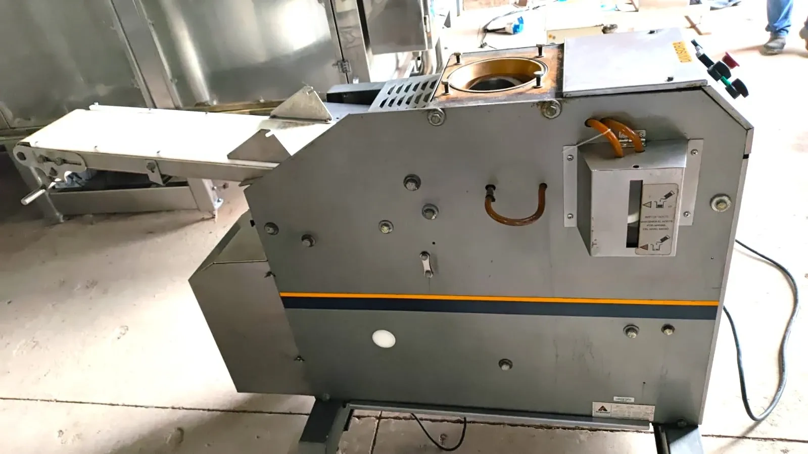 Divisora de massas em inox marca Argental modelo DB-800. Medidas do cilindro: 180 mm profundidade x 117 mm diâmetro. Está sem o funil. Tensão 220 V trifásico. Ano de fabricação 2015. Peso 448 kg.