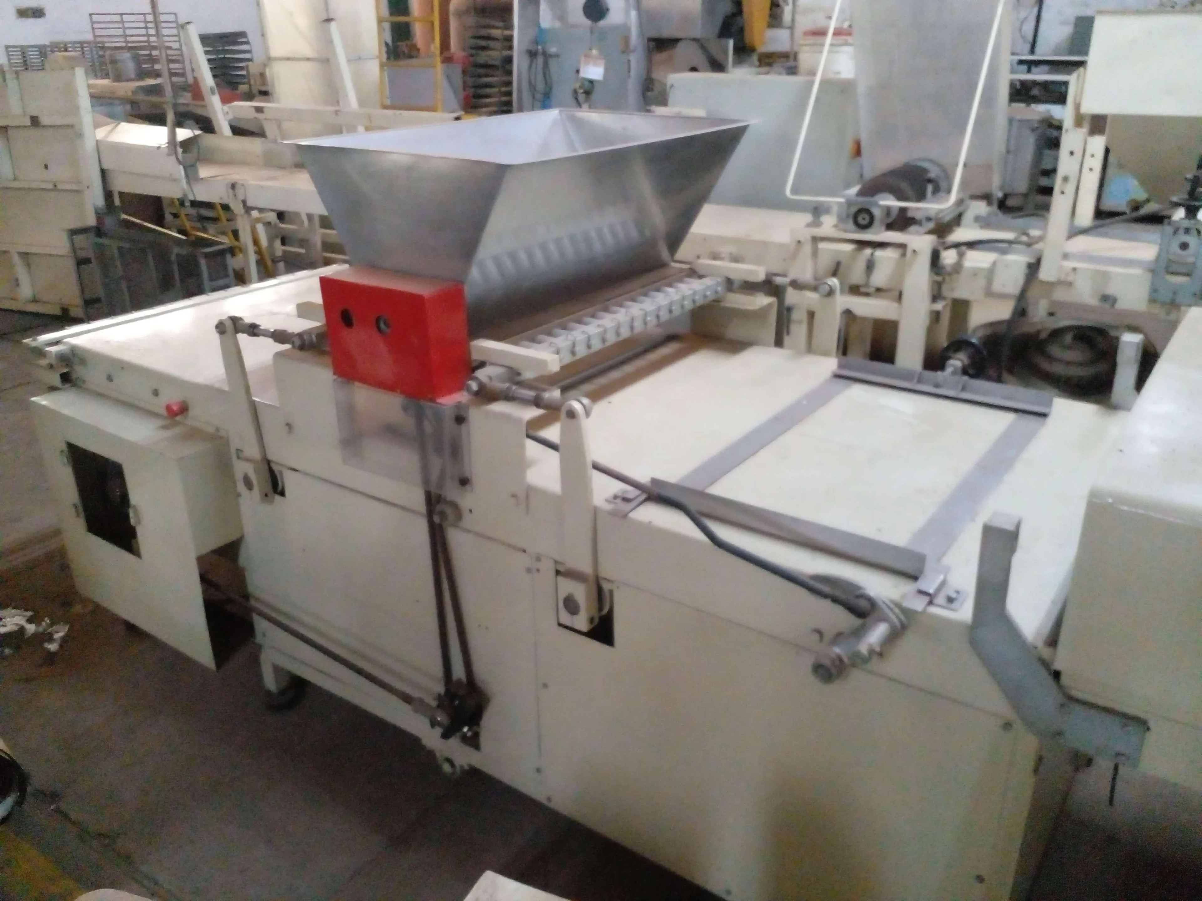 Dosadora de massas fluidas e semifluidas marca Pirog. Equipamento com 1 m de largura e régua com 28 bicos. Indicada para massas aeradas como suspiro, maria mole, merengue ou outras. Com receptor de massa em aço inox, dotado de embolos.
