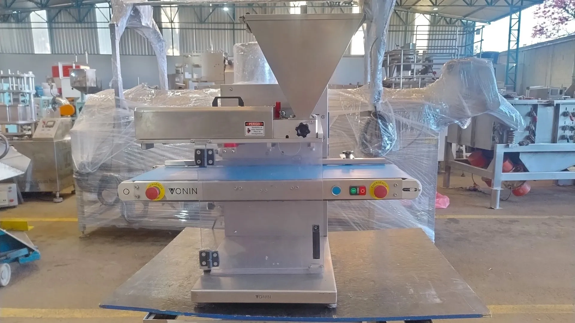 Dosadora tipo One Shot marca vonin modelo C3. Essa versão se destaca por ter espaço para até três bicos, expandindo sua capacidade produtiva para até 2.000 unidades/hora (baseado em unidades de 30 g). Dosagem com limite de 75 gramas por bico. Partes de contato, estrutura e proteções em Aço INOX 304. Dois reservatórios individuais com capacidade para 7kg em cada lado. Atuação e Pneumática IHM (Tela Touchscreen) e CLP. Indicada para dosagem de chocolates recheados ou maciços. Esteira com avanço e levantamento automático. Sistema de dosagem volumétrico com precisão menor de 1 g. Peso líquido 88 kg. Voltagem 220 V Monofásica.
