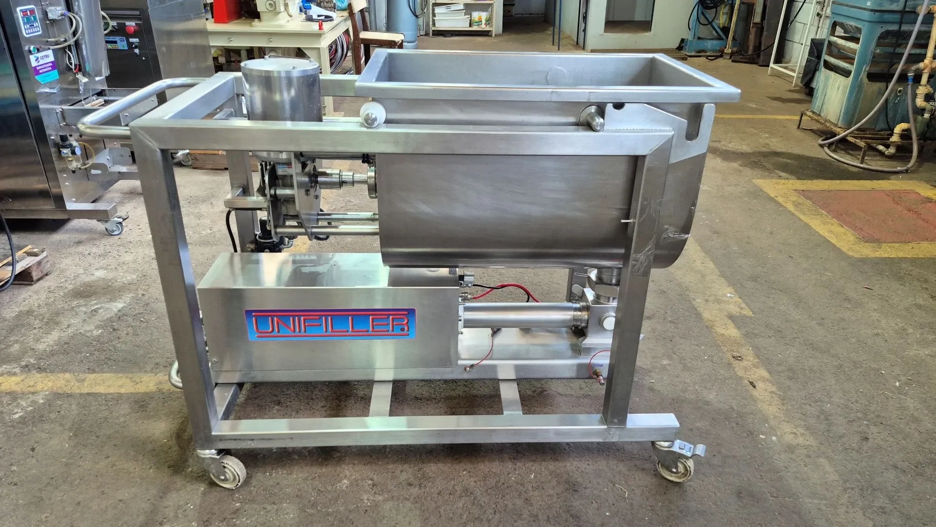 Dosadora de alimentos com receptor de produtos dotada de agitador marca Unifiller (Canadá) modelo Pro 2000. Projetada para produtos alimentícios com pedaços extra grandes (até 3,8 cm) ou alta viscosidade, como massas de bolo, recheios de torta, chili, mousse e até hummus ou creme de trigo com partículas. Velocidade de até 80 ciclos por minuto. O receptor do produto com agitadores internos (160 litros) assegura distribuição homogênea de partículas das misturas.