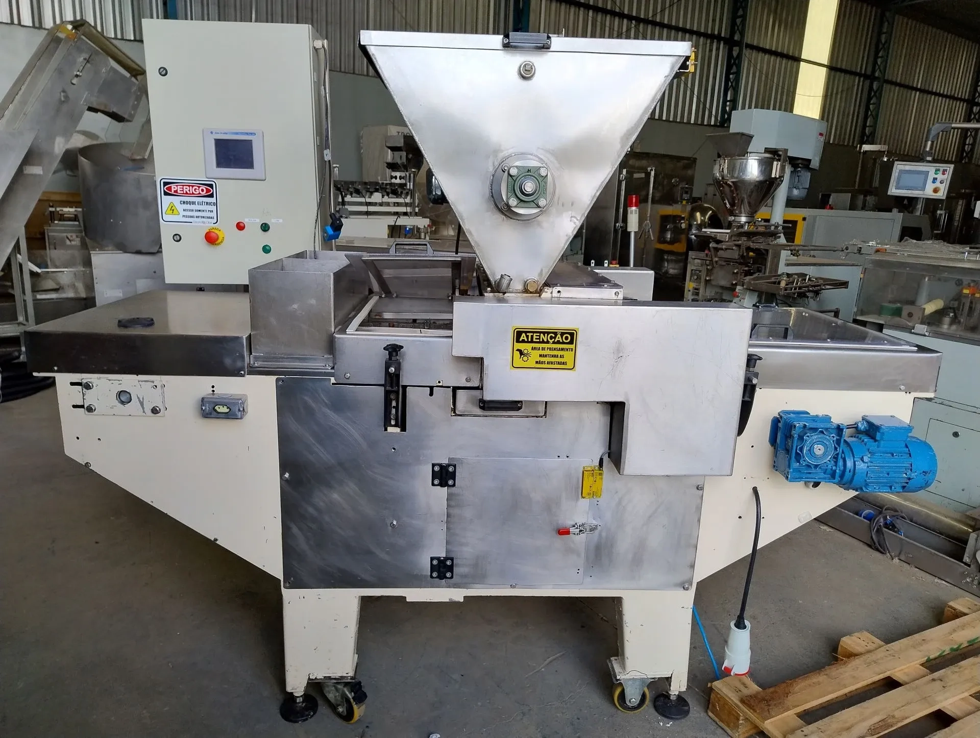 Dosadora de chocolate automática marca Piróg. Equipamento com largura de 1 m e 22 bicos para dosagem de chocolate maciço. Silo receptor com aquecimento autônomo (resistências) e agitador. Partes de contato com produto em aço inox, estrutura em aço carbono com pintura epóxi e régua de dosagem em bronze.
