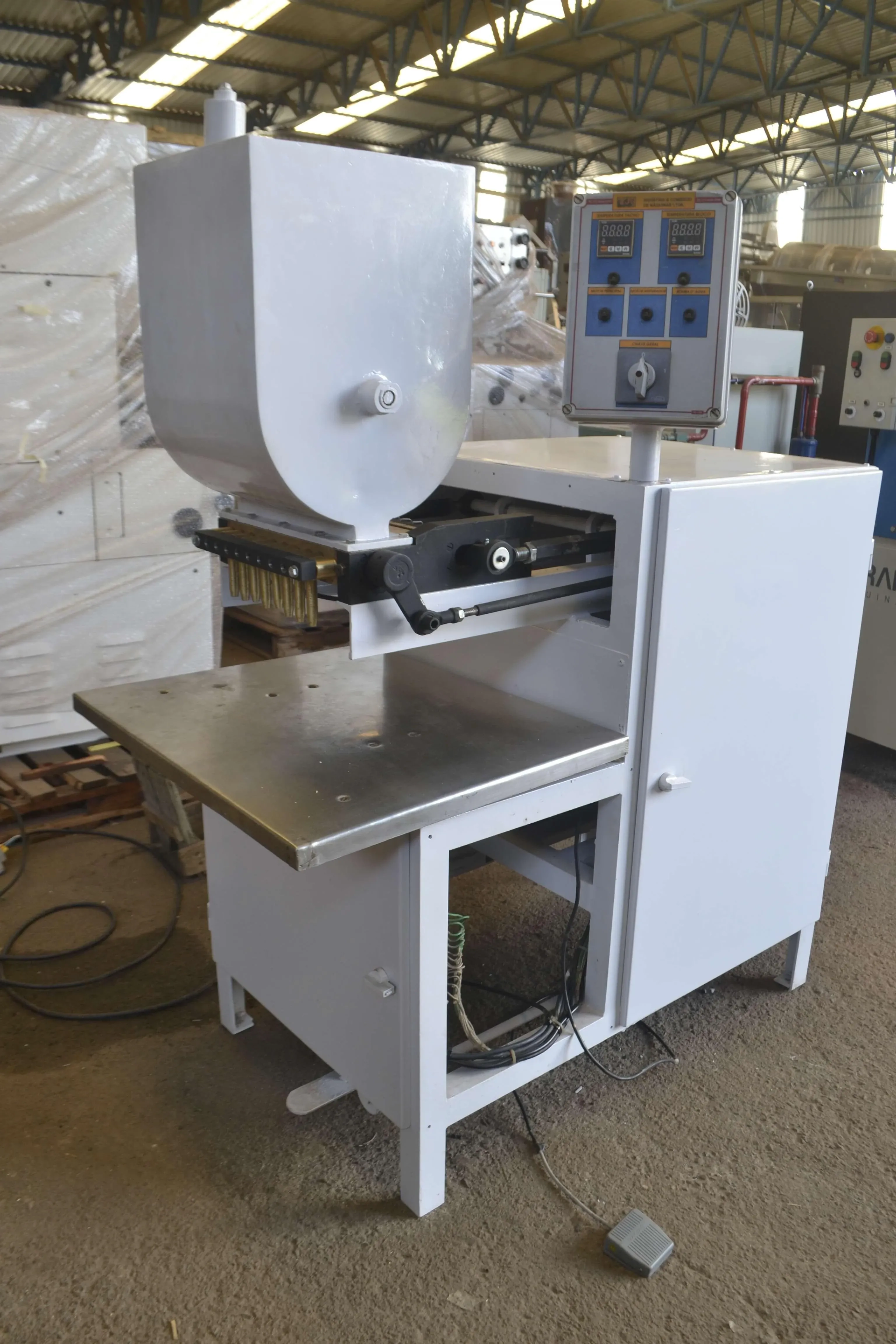 Dosadora de chocolate 8 bicos marca LJC. Equipamento semiautomático, com tacho encamisado em aço inox, dotado de misturador, e estrutura em aço carbono. Com controle de temperatura do tacho e do bloco.