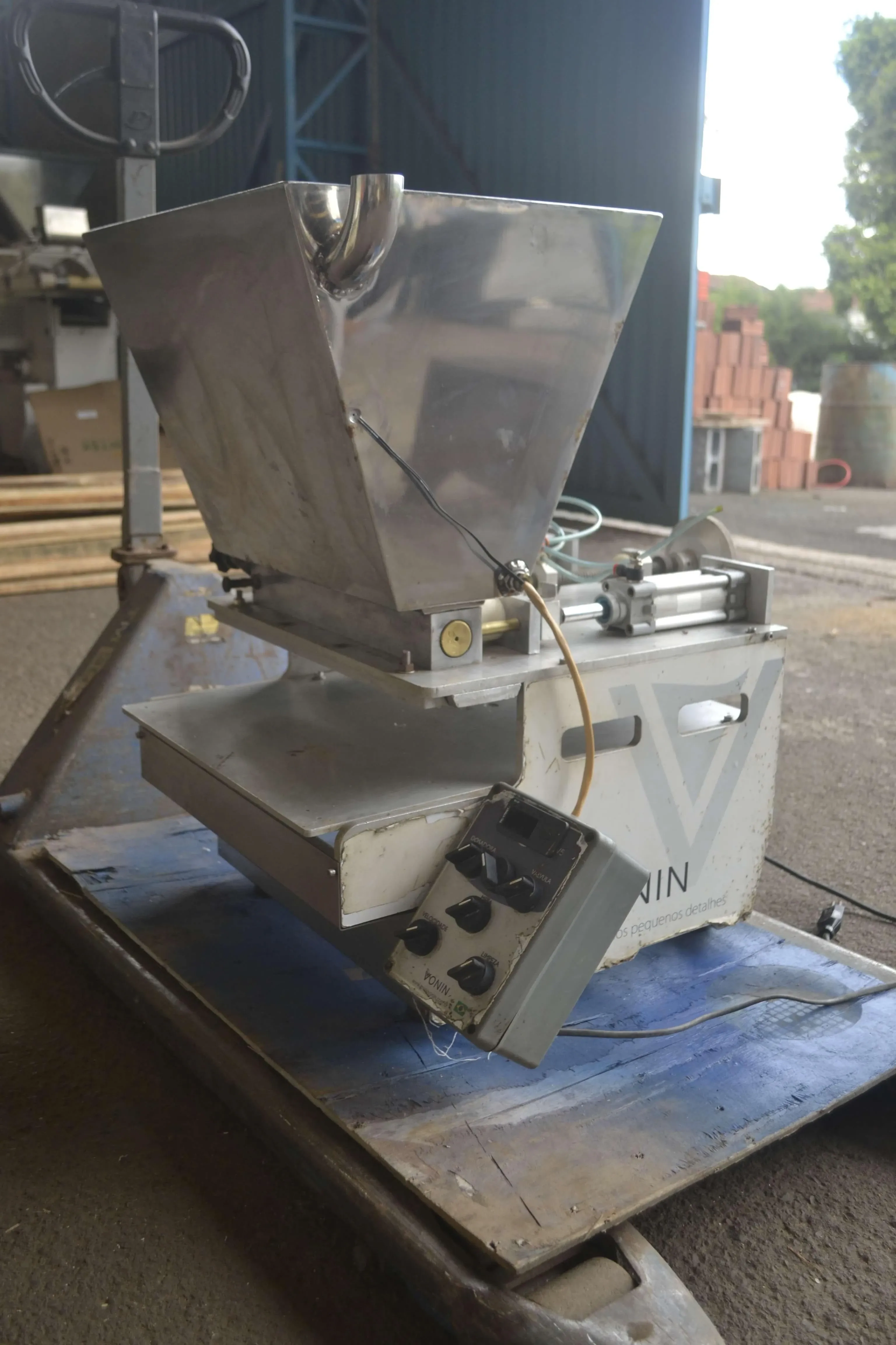 Dosadora de chocolate semiautomática marca Vonin. Modelo: DV5. Equipamento em aço inox 304, com 5 bicos, largura útil de 400 mm (aceita formas de 400 x 600 mm) e capacidade de dosagem de até 6 mil unidades hora. Com controle de temperatura e de gramatura de dosagem (volumétrico), levantamento automático da mesa e sistema de dosagem por sucção e injeção. Capacidade do reservatório: 20 litros. Atuação pneumática (requer compressor para trabalhar). Voltagem: 220 V/monfásica