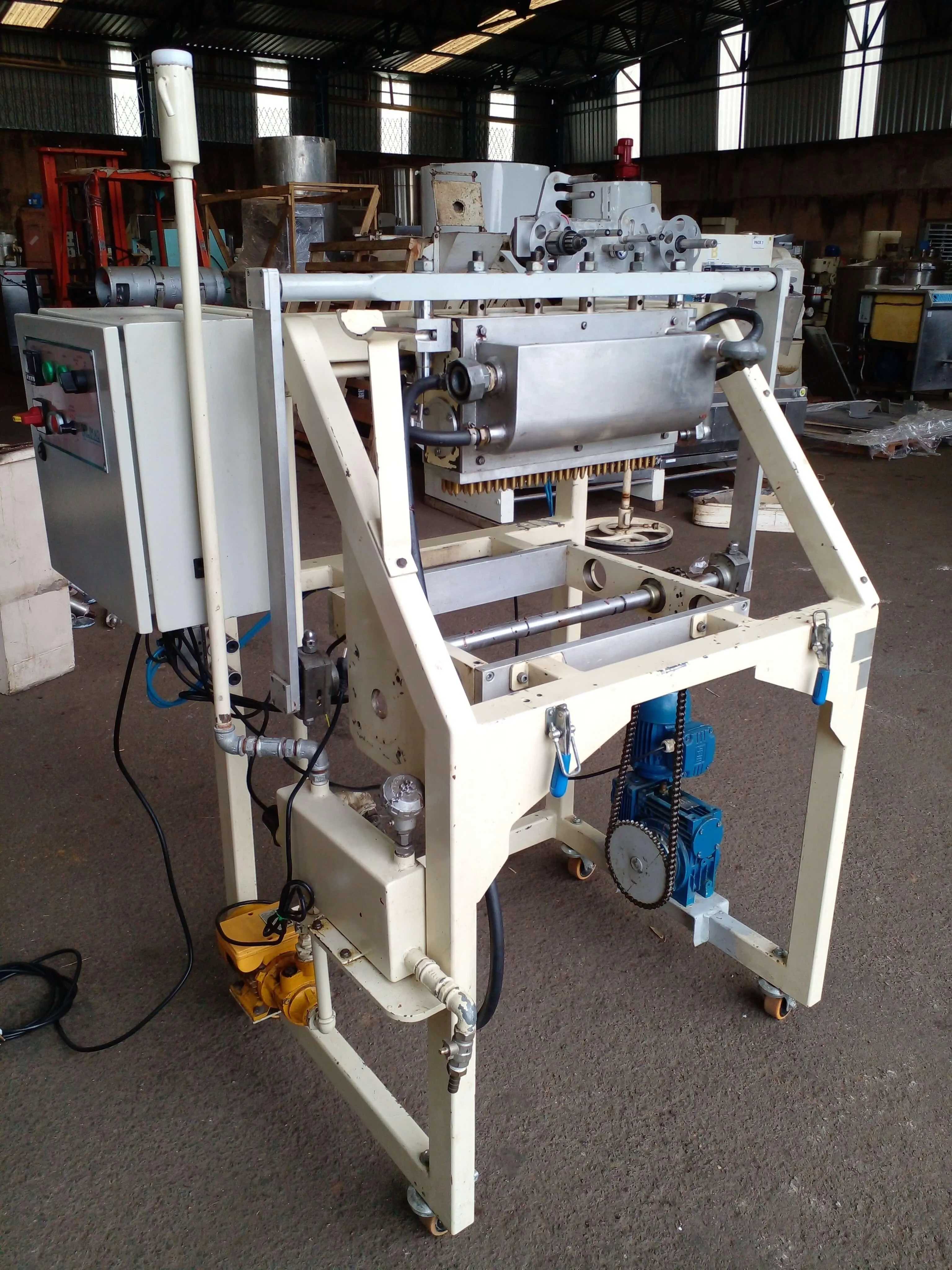 Dosadora de gotas de chocolate marca Limaq. Modelo: DSLV 4. Com régua de 130 bicos em cobre e 400 mm de largura, equipamento com estrutura para acoplagem em túnel de resfriamento. Motor Trifásico 0,18 Kw. 0,25 CV.