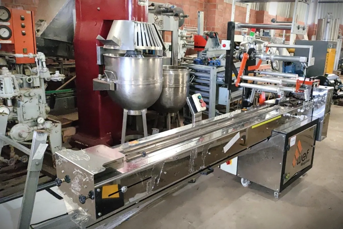 Embaladora flow pack marca WEF modelo MPF-150. É uma máquina embaladora Flow Pack indicada para todos os tipos de embalagens (individuais e coletivas para produtos sólidos), no ramo alimentício, farmacêutico, higiênico, químico entre outros. Produtividade de até 150 unidades/min (conforme produto a ser embalado) Balança com desbobinador automático, com sistema de freio que controla a tensão do filme. Motor elétrico de 1/4 HP, acionado e programado através de inversor de frequência. Equipamento todo produzido em aço inoxidável. Dimensões da embalagem: comprimento de 35 a 500 mm e largura de 110 mm. Dimensões: - Altura: 1,65 m - Largura: 950 mm - Comprimento: 3,50 m - Comprimento Mordente: 130 mm - Bobina Diâmetro Interno: 75 mm - Bobina Diâmetro Externo: 300 mm Máximo - Bobina Largura: 330 mm Máximo - Peso: 410 Kg