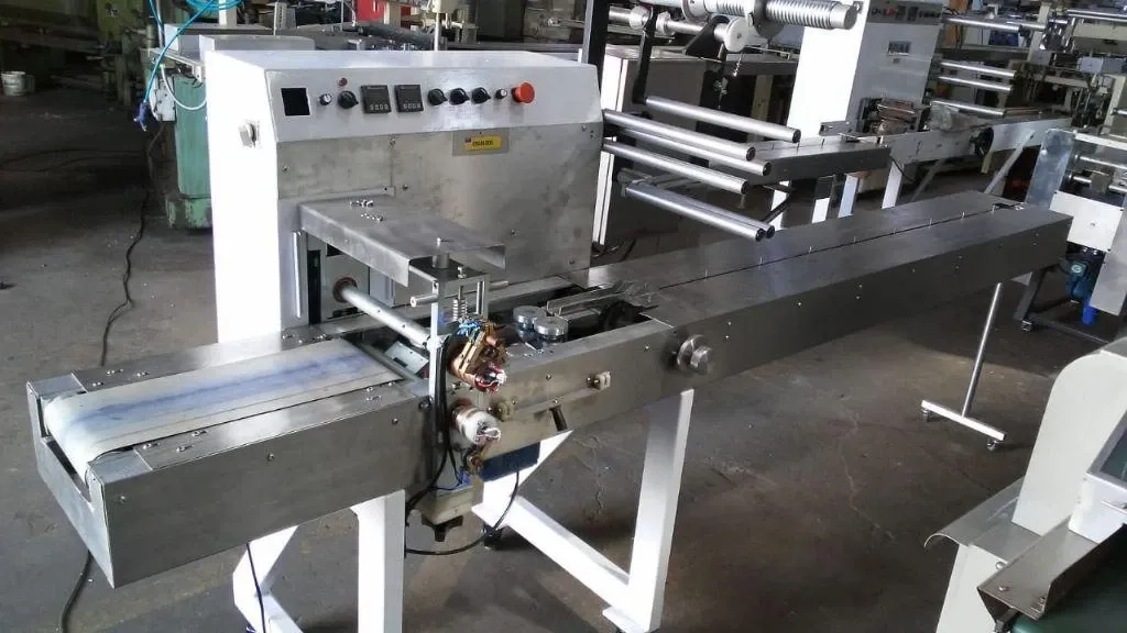 Embaladora Flow Pack marca Emblamaq. Produção até 80 por minuto, varia conforme filme e produto. Com dois motores com 1,5 kw cada. Regulagem de temperatura nos mordentes e solta inferior. Regulagem da dimensão da embalagem via formato. Para produto: 60 mm largura x 30 mm altura x 150 mm comprimento.