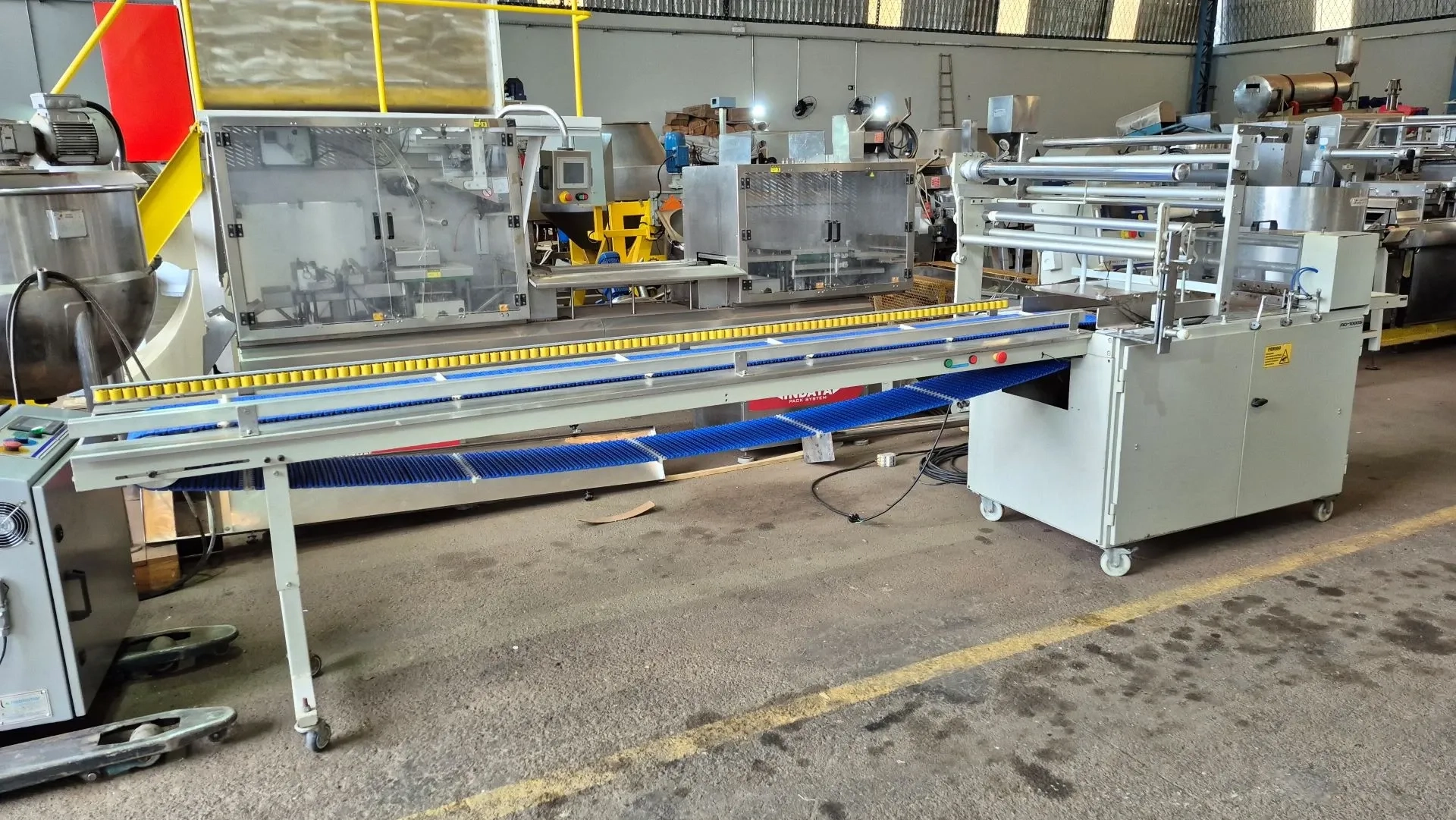 Embaladora flow pack para pães de hambúrguer e cachorro quente marca Rodopac modelo RD 1000S CF. Parte de contato em aço inox. Com foto célula. Ano de fabricação 2021. Tensão 220 V. Peso 720 kg. Com IHM Schneider Electric Magelis.