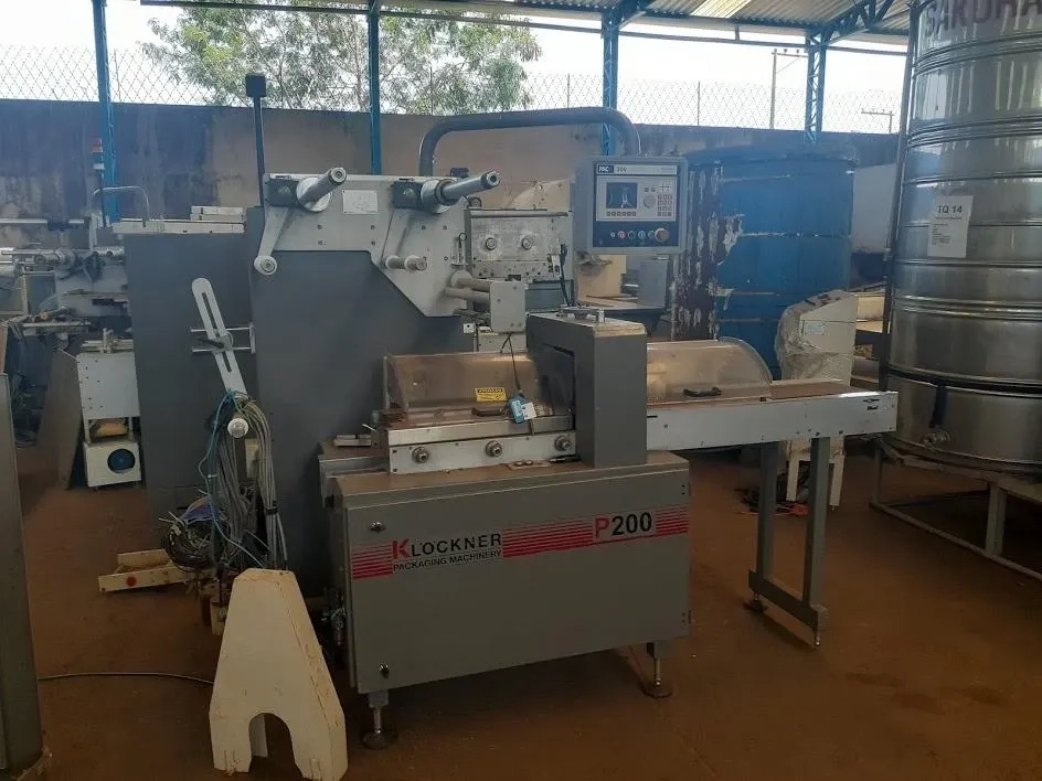 Embaladora Flowpack marca Klockner. Modelo: Pack 200. Produção: até 350 embalagens/minuto. Embaladora de fluxo horizontal, com servo motor, para filme selável a frio ou a quente, indicada para produtos de panificação, confeitaria, chocolates e outros. Temperatura máxima dos rolos seladores: até 350 graus. Temperatura máxima das lâminas seladoras: 350 graus. Atende a 24 formatos diferentes de pacotes.