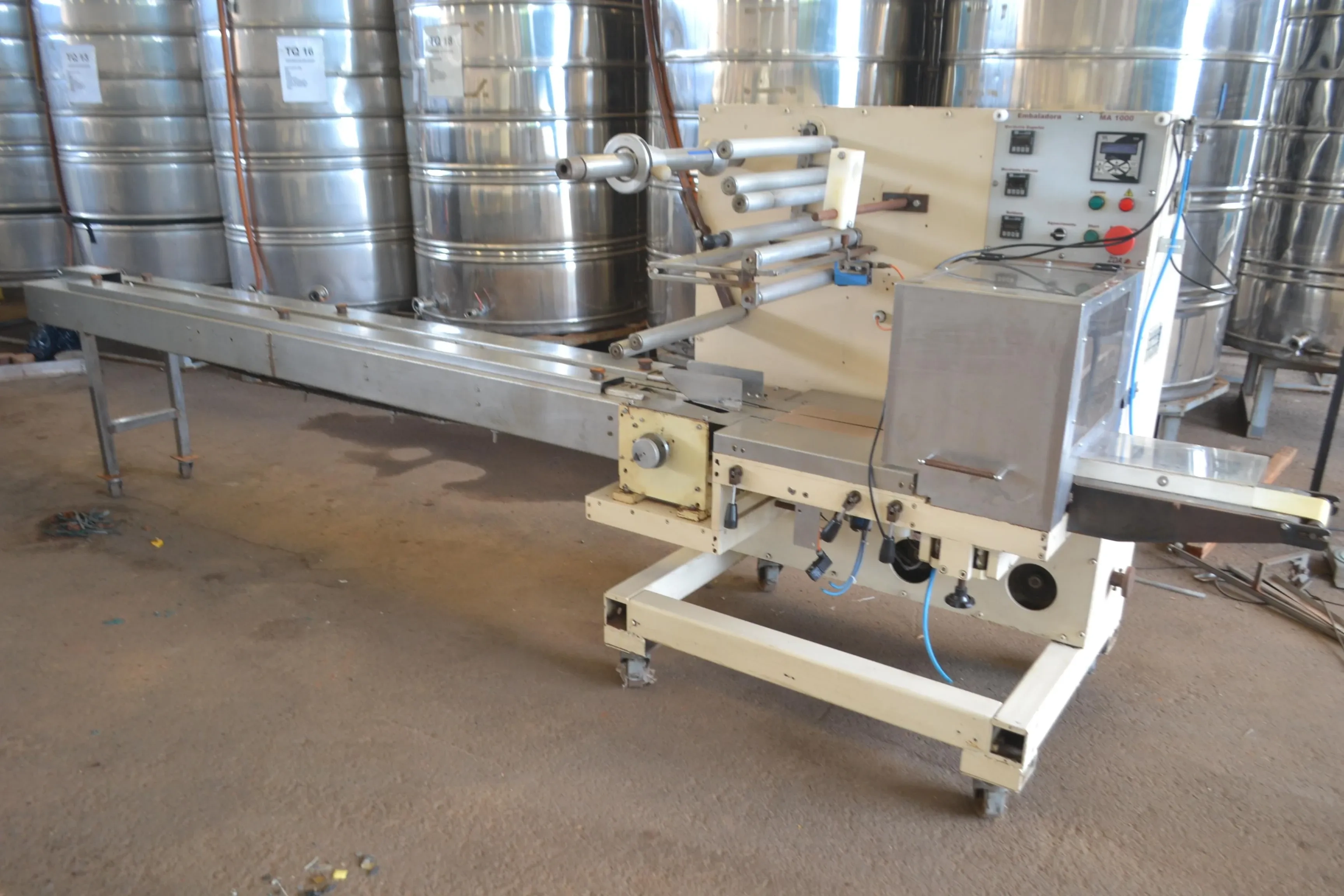Embaladora flowpack marca Makweg para chocolates, doces e outros. Modelo: MA-1000. Produtividades: 80 unidades/ aproximadamente. Com CLP, fotocélula e mordente duplo. Dimensões: - Produção aprox.: 80 unidades/ min - Largura total: 1,00 m - Altura total: 1,50 m - Comprimento total: 4,50 m - Comprimento da esteira: 3 m.