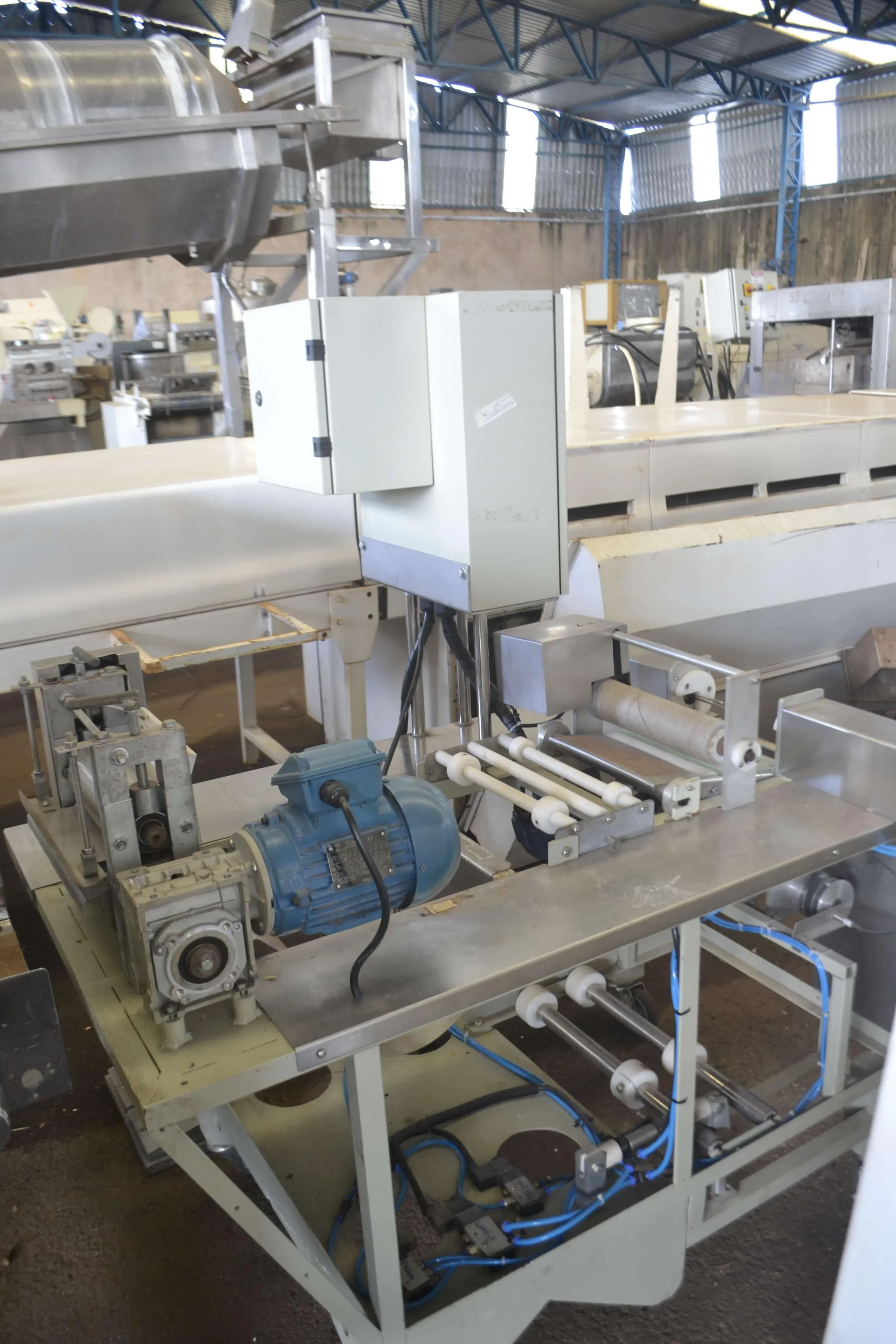 Enrolador de massa de pastel semiautomático. Largura do rolo: 200 mm. Motor: trifásico 220 V (1 CV).