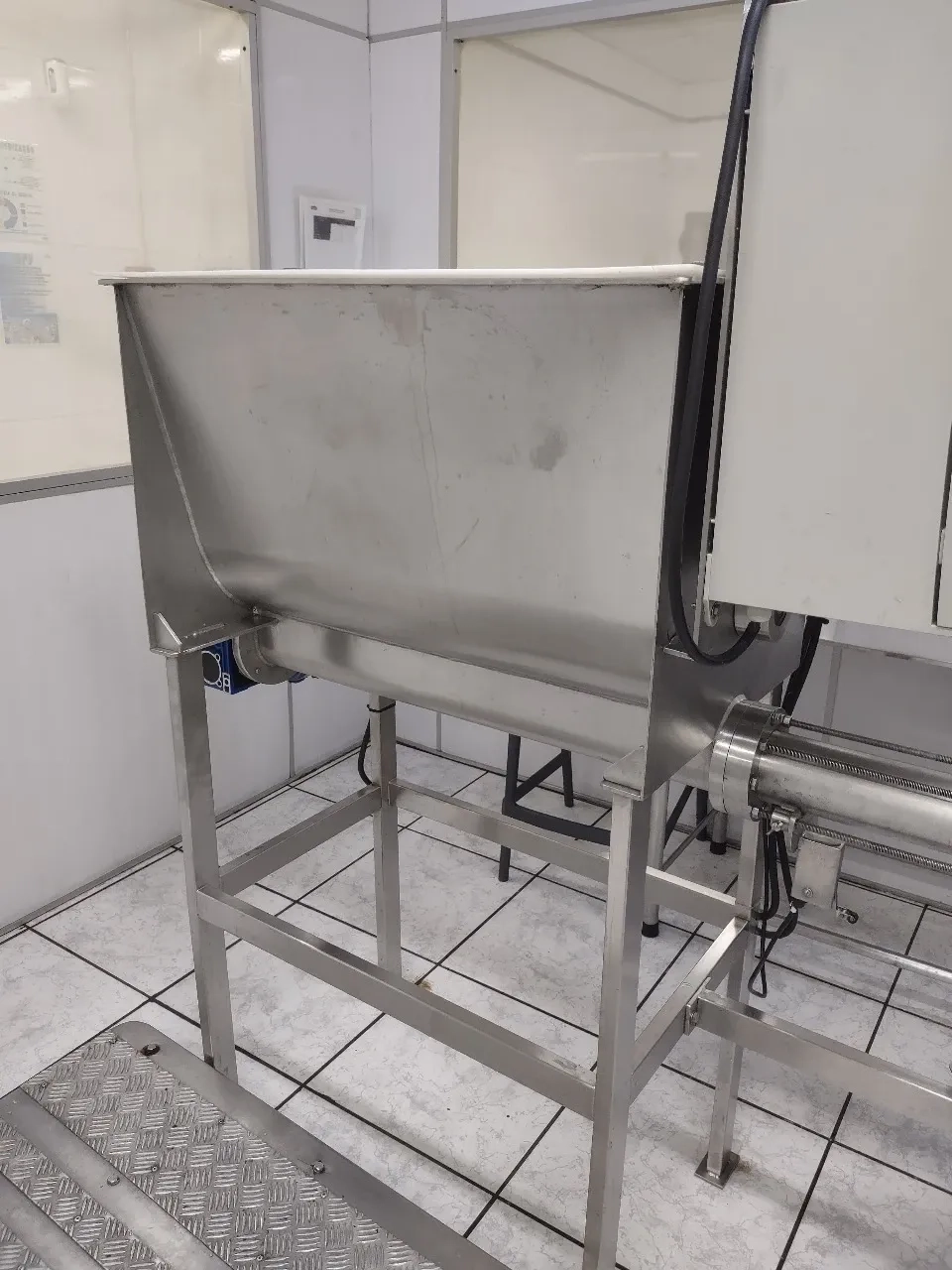 Envasadora dosadora pesadora com misturador horizontal de pás em aço inox para produtos pastosos e granulados capacidade 120 kg marca Peres & Canheiro. Para produtos pastosos e granulados como alho triturado, pasta de alho, doces cremosos em potes como doce de leite, geleias, doces de frutas entre outros em copos potes e frascos. Com manual. Tensão 220 V.