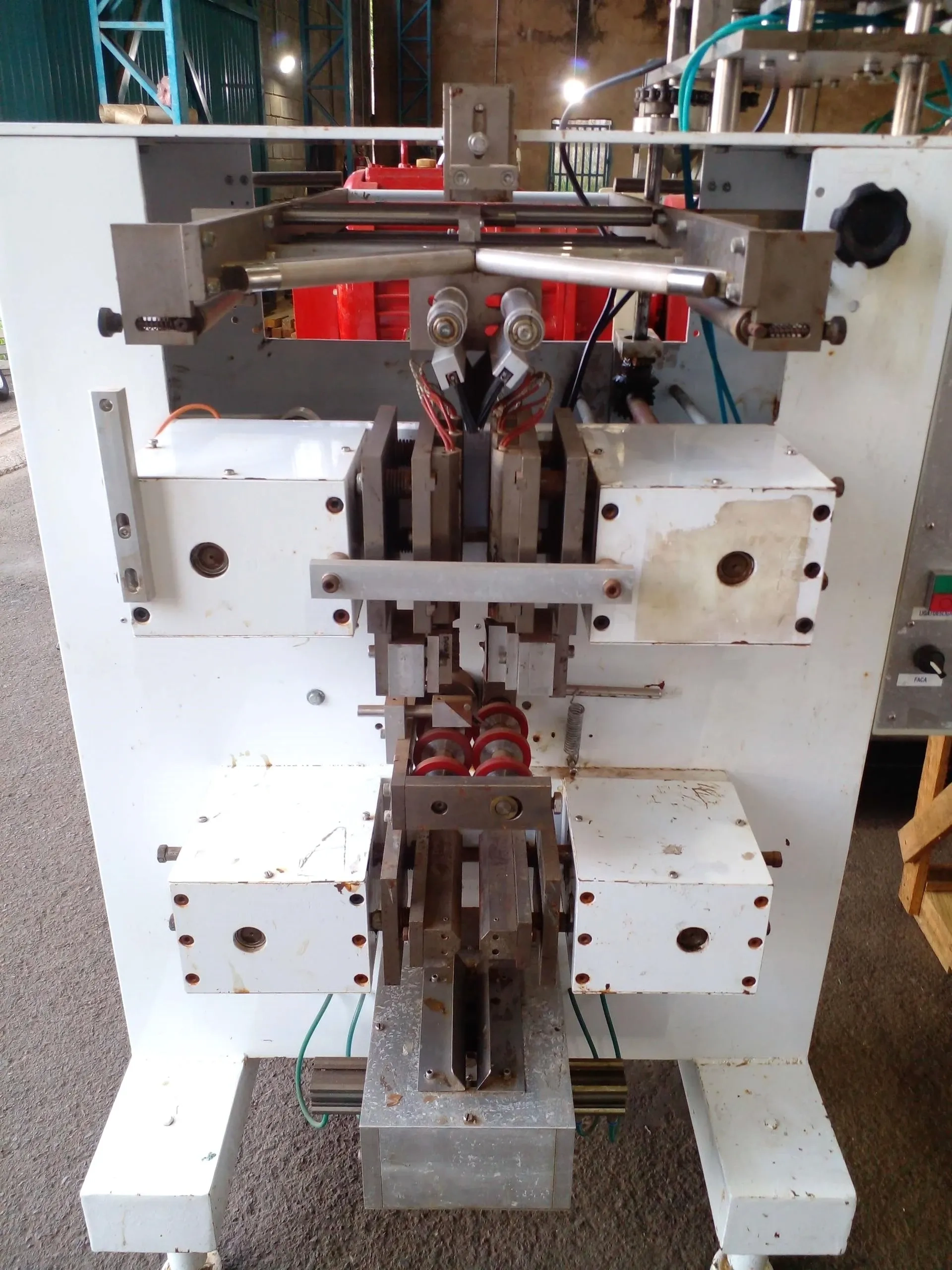 Envasadora de sachês de produtos líquidos, semilíquidos e pastosos marca Iasipack. Capacidade de até 6 mil ciclos por hora, em uma via. Com estrutura em aço carbono, foi desenvolvida para formar embalagens com 4 soldas, com estrutura flexível, termo-selável, laminada ou poli papel. Indicada para envase de produtos como maionese, catchup, mostarda, molhos e azeite, entre outros. Quadro elétrico com controladores de temperatura das soldas, de dosagem, corta respingo e fotocélula.