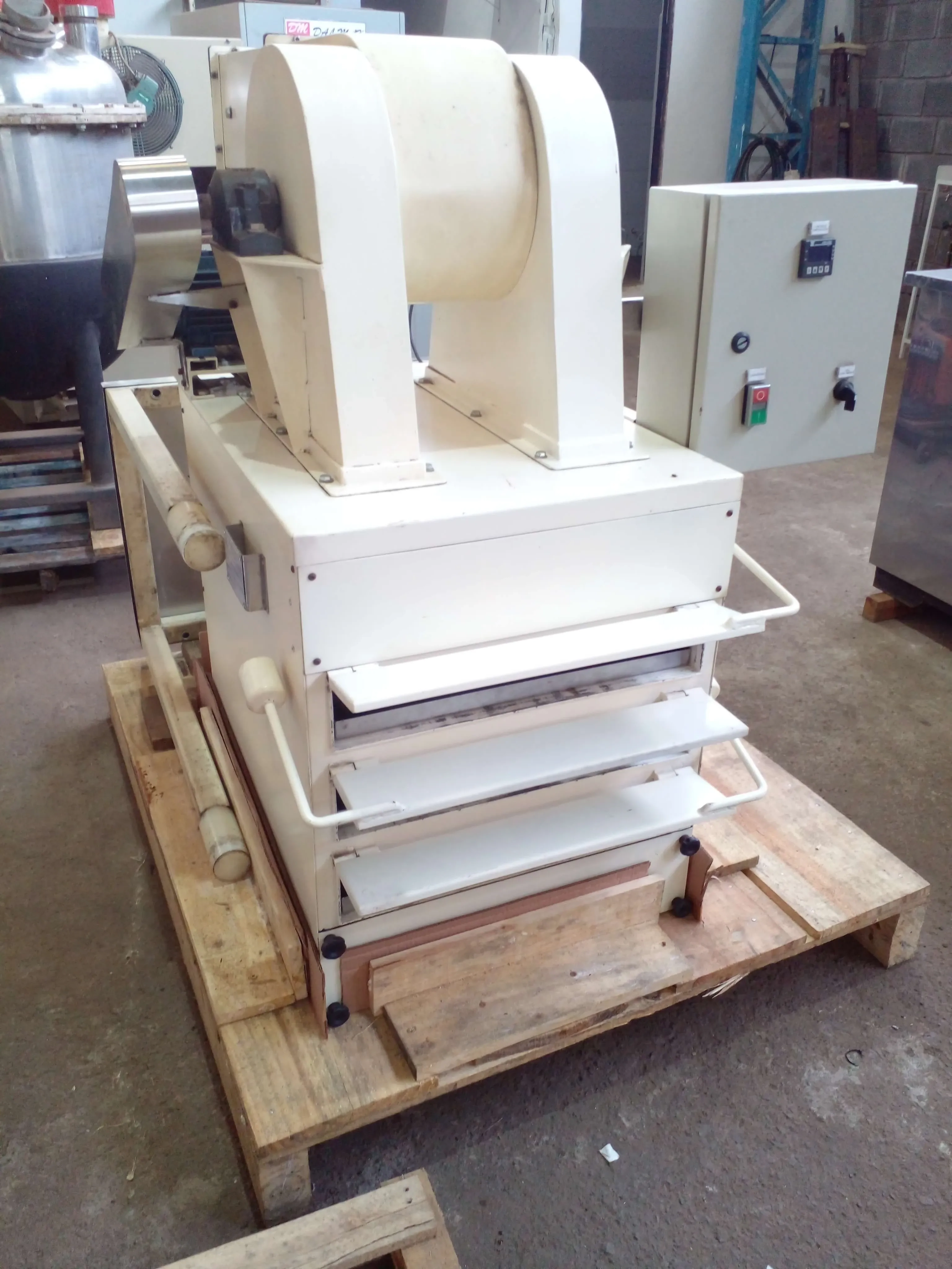 Estufa Secadora marca Kohls Indústria de Máquinas. Estufa secadora com circulação de ar quente com três bandejas perfuradas (grau alimentício). Dimensões bandejas: 500 x 700 mm. Equipamento em aço carbono com quadro elétrico equipado com controlador de temperatura. Voltagem: trifásica 380 V. Peso aproximado 300 kg.