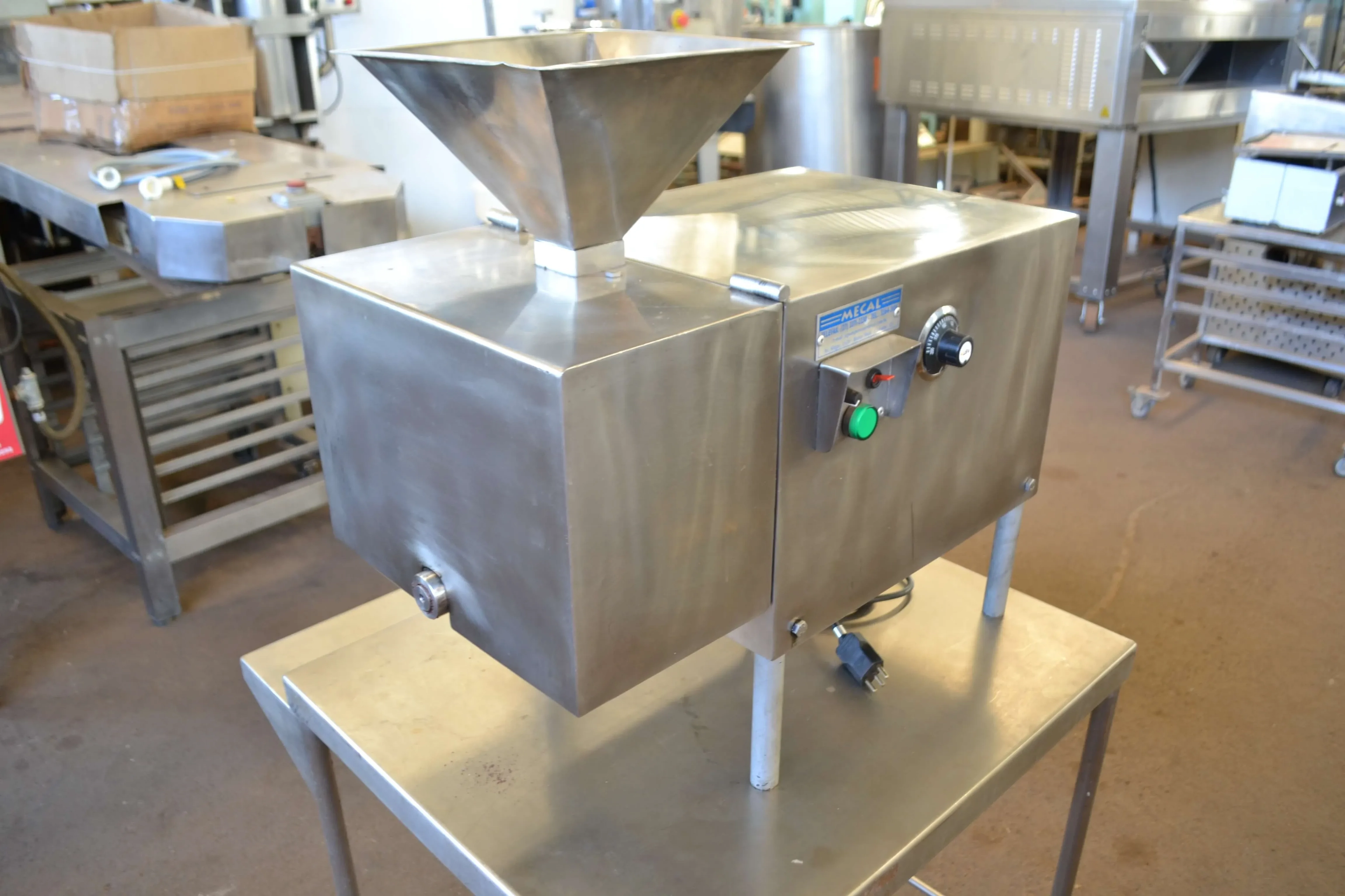 Extratora de manteiga de cacau marca Mecal. Capacidade de 1 Kg de manteiga por hora. Totalmente confeccionada em aço inox 304. Motor de 1 CV 735 Watts) com pré aquecimento.