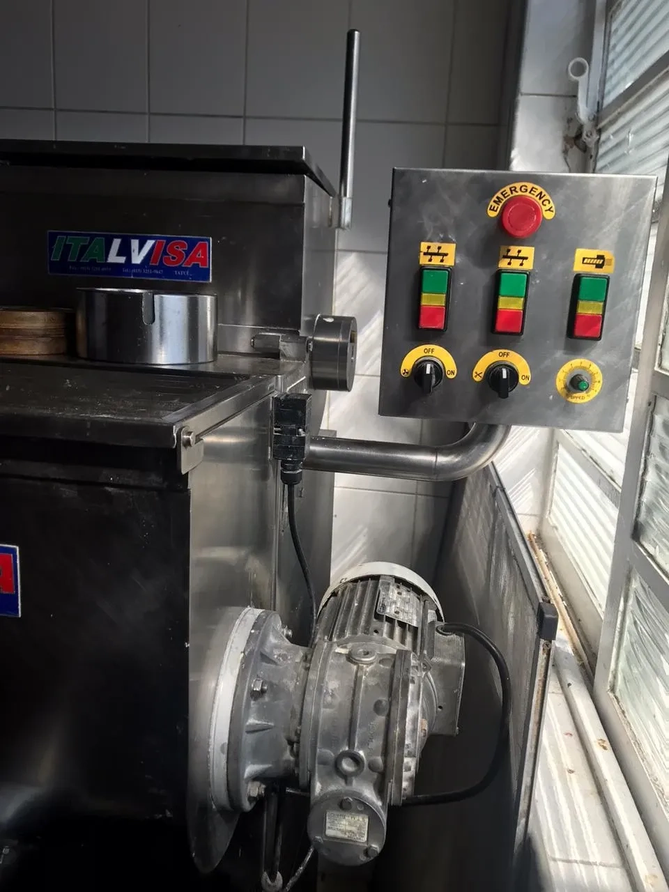 Extrusora de massas Pastaia capacidade 60 Kg/h Pastaia P55. Extrusora composta de duas cubas, equipada com ventilador para pré-secagem, câmara de resfriamento de água e facas para corte com variador de velocidade.