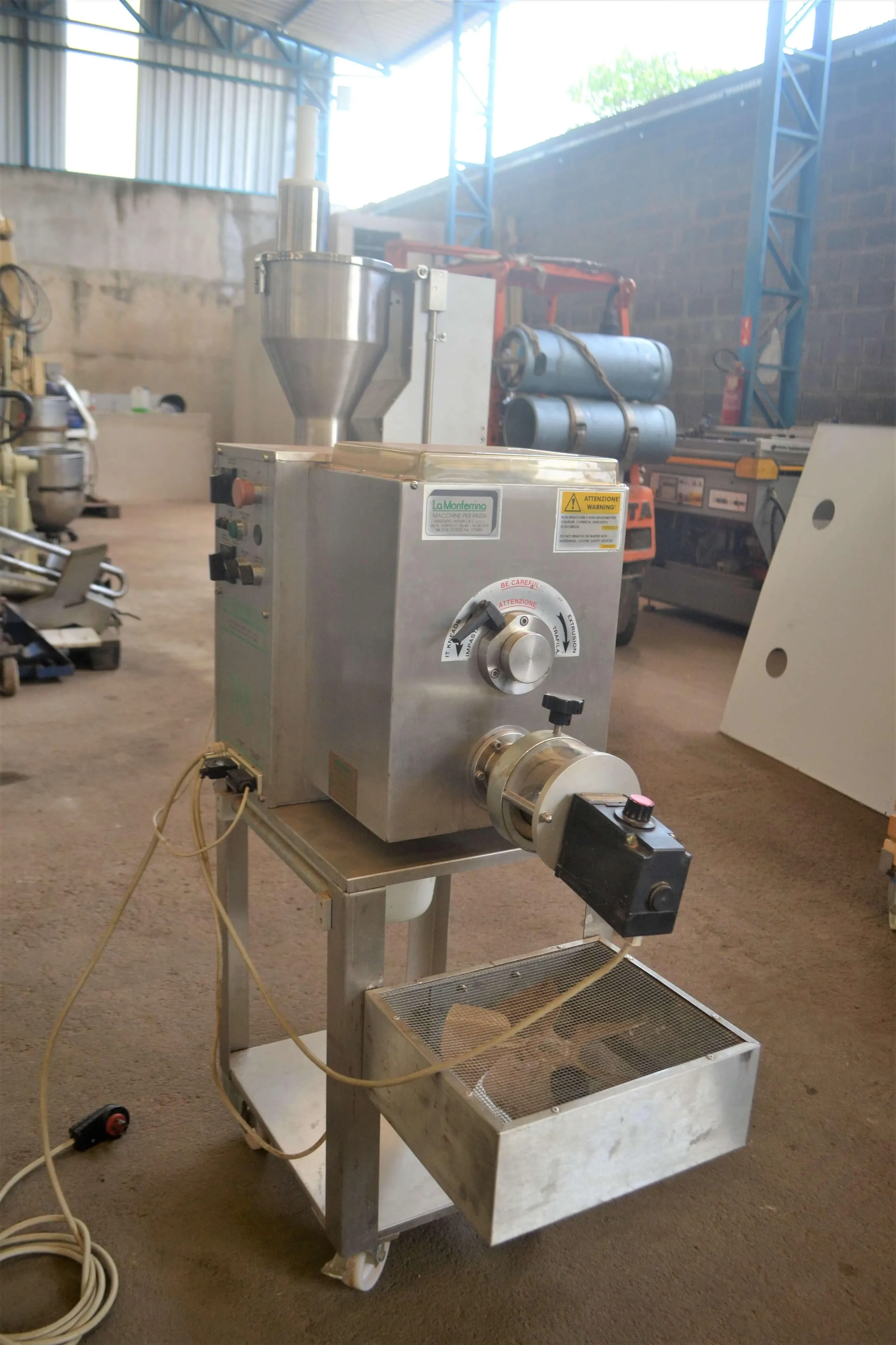 Extrusora de massas e fabricadora de nhoque capacidade 18 kg/hora marca La Monferrina. Modelo: P6. Equipamento indicado para pequenos restaurantes, rotisseries, pizzarias etc, com quatro trafilas, cortador automático, ventilador, sistema de refrigeração e bandeja para recepção das massas. Confeccionado externamente em alumínio anodizado e em aço inox 304 nos locais onde há contato com a massa.