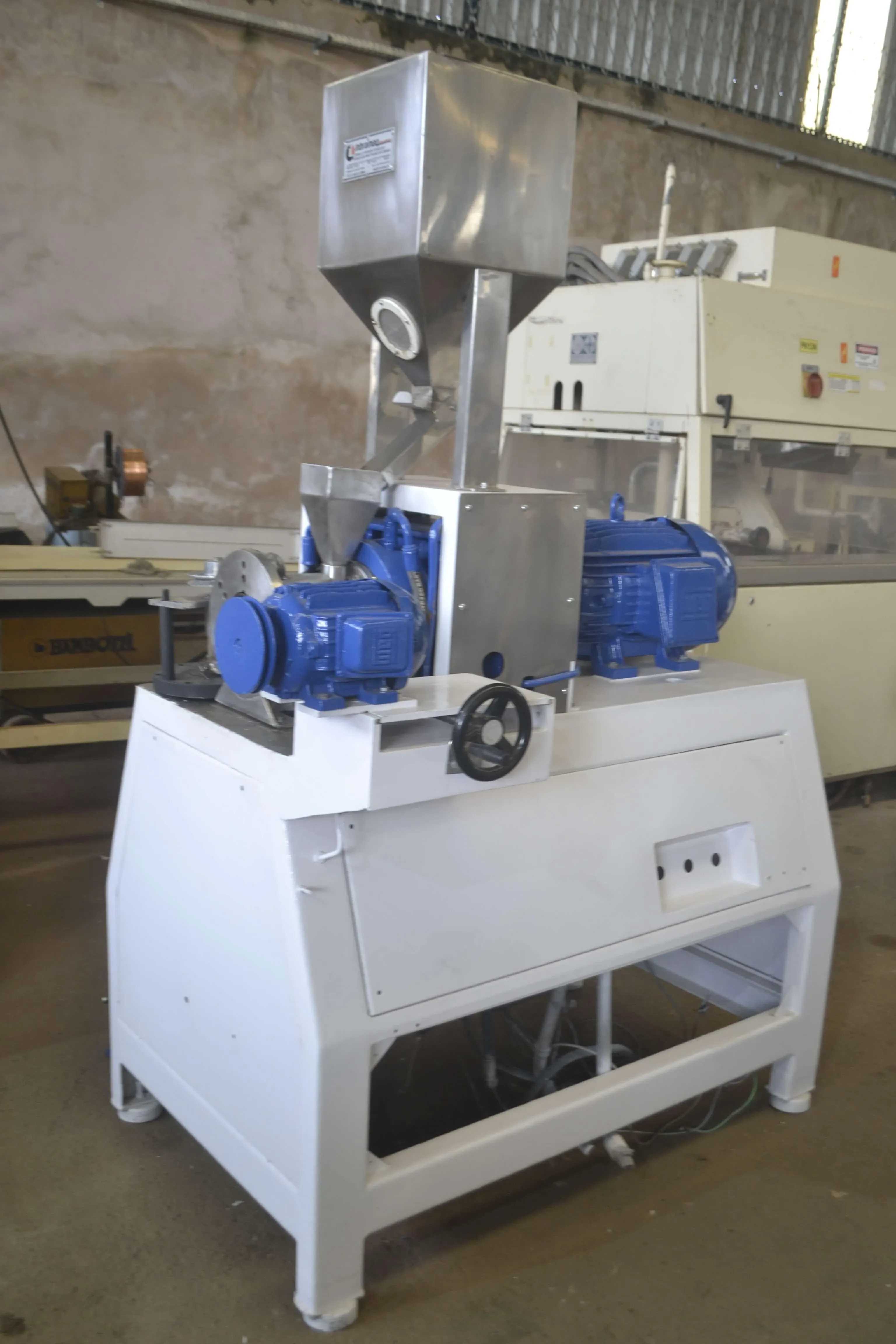 Extrusora mono rosca para salgadinhos marca Imbramaq. Capacidade aproximada: 150 Kg. Com sistema de extrusão por fricção, composta por silo pulmão, dosador volumétrico e processo de corte com velocidade variável por sistema de polias. Estrutura em aço carbono pintada com epóxi. Com trafilas de anéis de cebola e concha.