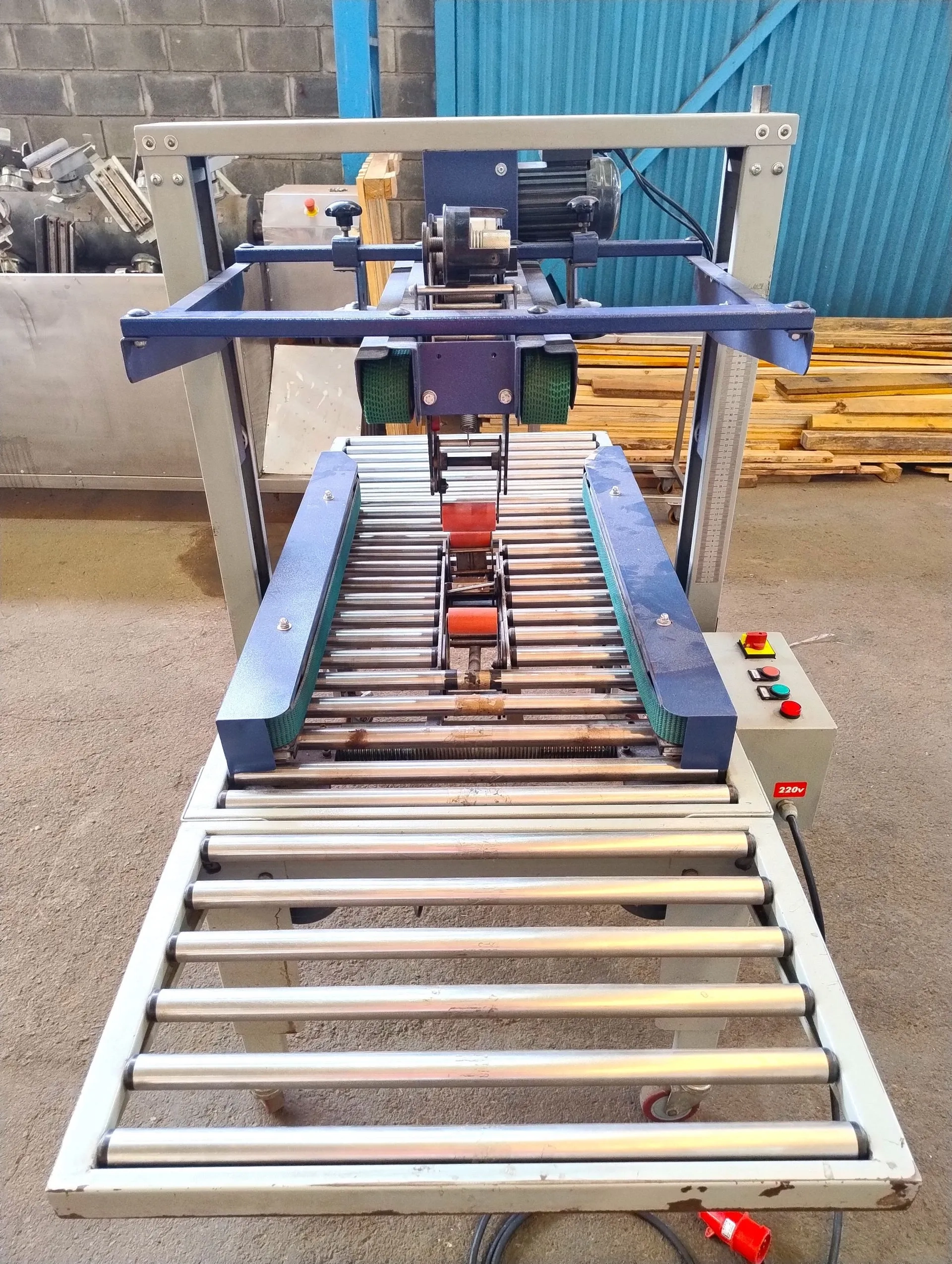 Fechadora Seladora de caixas de papelão marca Tecmaes modelo TMY 500 1A/ SL. Utilizada para fechamento de caixas com fitas adesivas. Semi-Automática com tração superior e lateral. Para caixas até 45kg. Largura da fita de36 até 60 mm. Voltagem 220 v, 50/ 60 Hz. Potência 0,6 KVA.