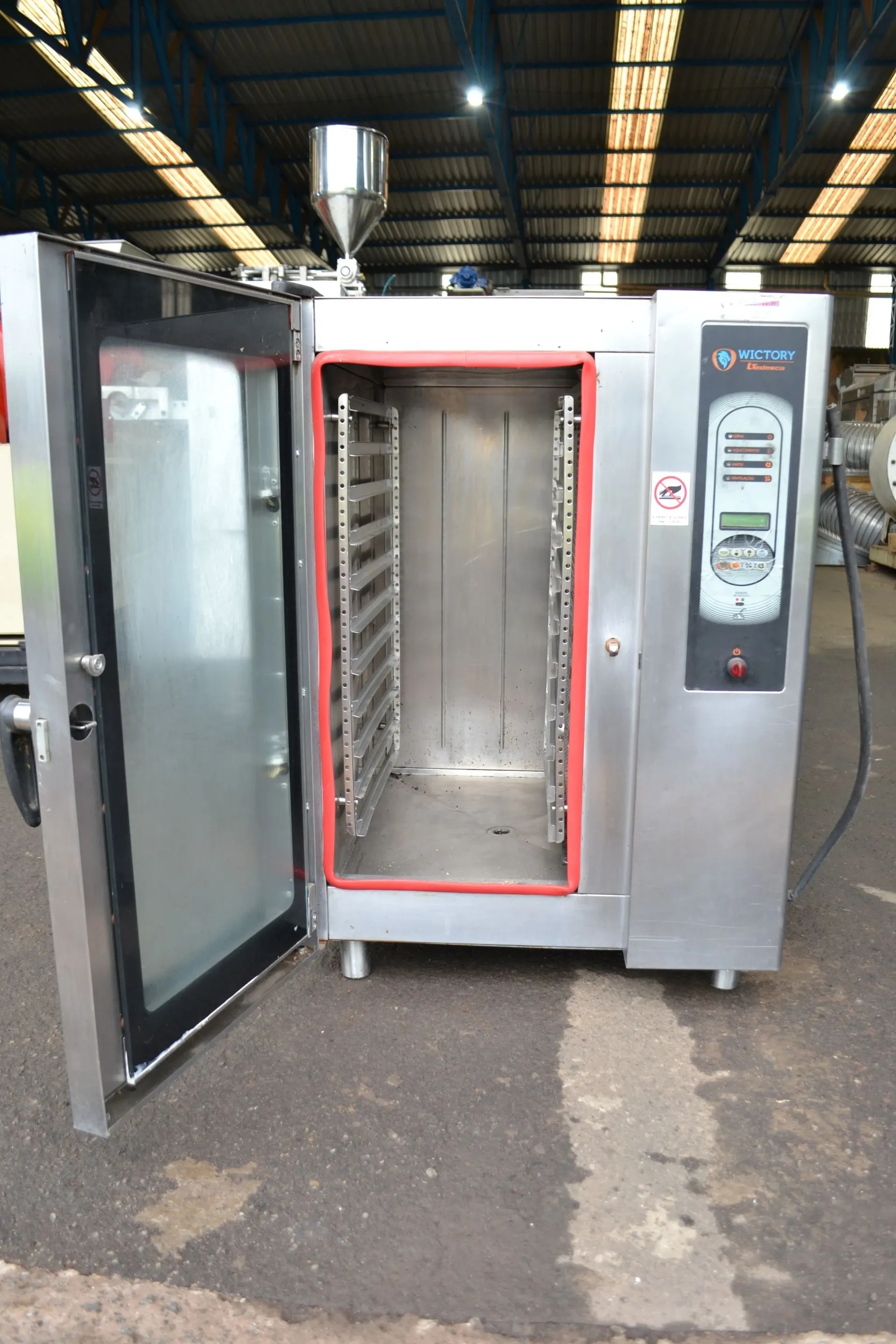 Forno Combinado Programável Elétrico marca Wictory LTedesco modelo WC-11E com 11 assadeiras. Utilizado na cozinha para preparação de alimentos desidratados, panificação, confeitaria, gratinados e grelhados. Fabricado em aço Inox. Tensão 220 v Trifásico. Corrente 50 A. Conexões de entrada de água: 3/4" BSP. Método de instalação chão ou cavalete. Volume útil da câmara: 860 x 350 x 650 mm (Alt.xLarg.xProf.). Volume 196 L.