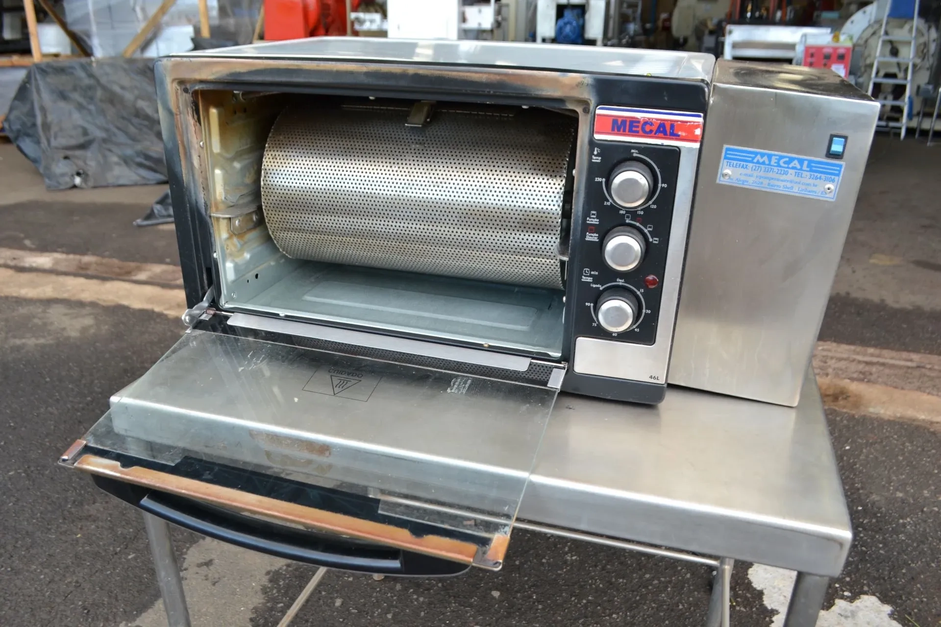 Forno elétrico especial para torrar amêndoas de cacau marca Mecal. Capacidade de 4 Kg por batelada. Cilindro do torrefação em aço inox 304. Frente do forno em aço inox 304. Com 1700 Watts, 110 volts.