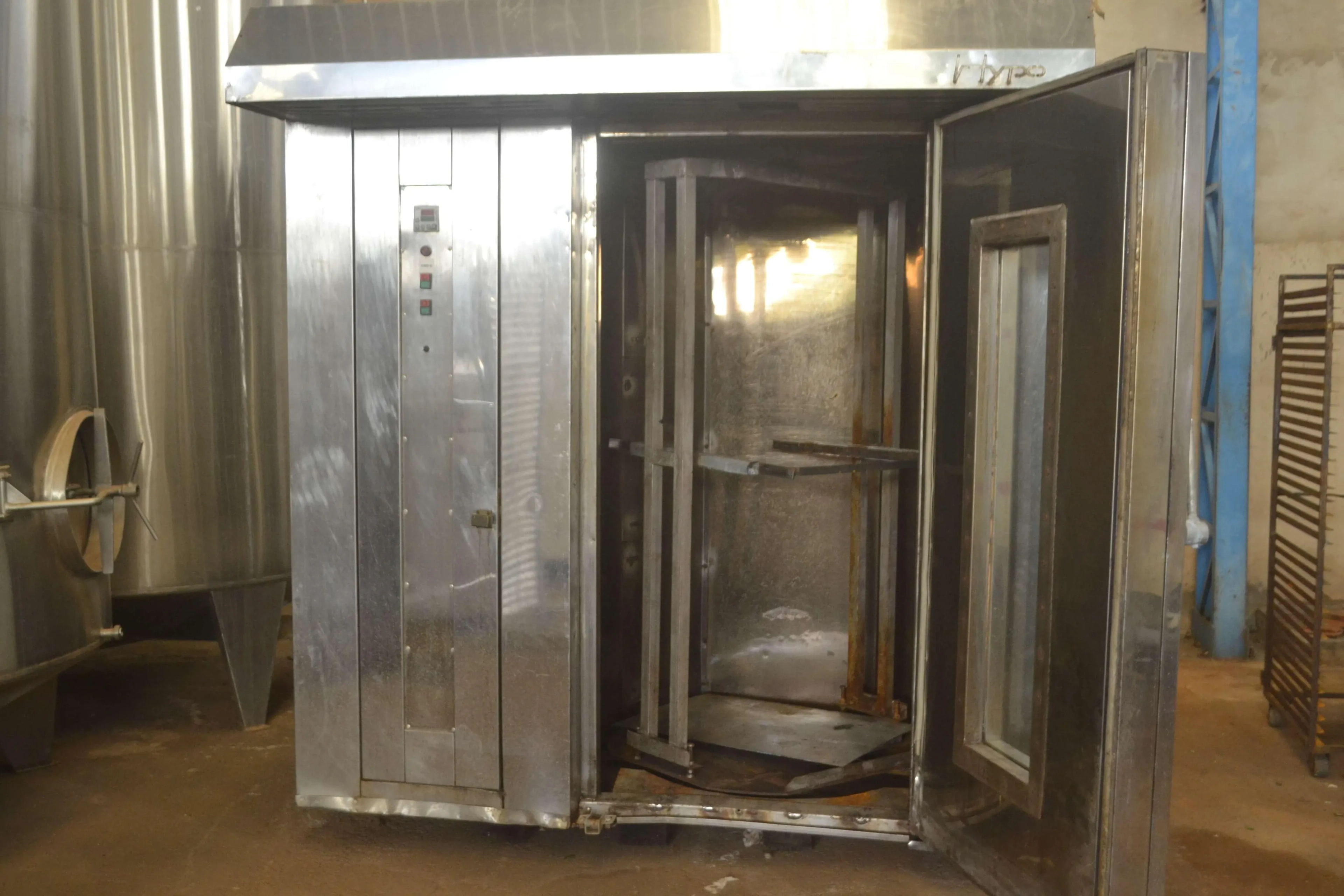 Forno rotativo a gás um carrinho marca Hypolito. Em aço inox externo e interno (câmara de cozimento). Indicado para produtos de panificação, doces, biscoitos etc. Com painel de controle frontal. Acompanha dois carrinhos de 600 x 800 mm para 66 assadeiras.