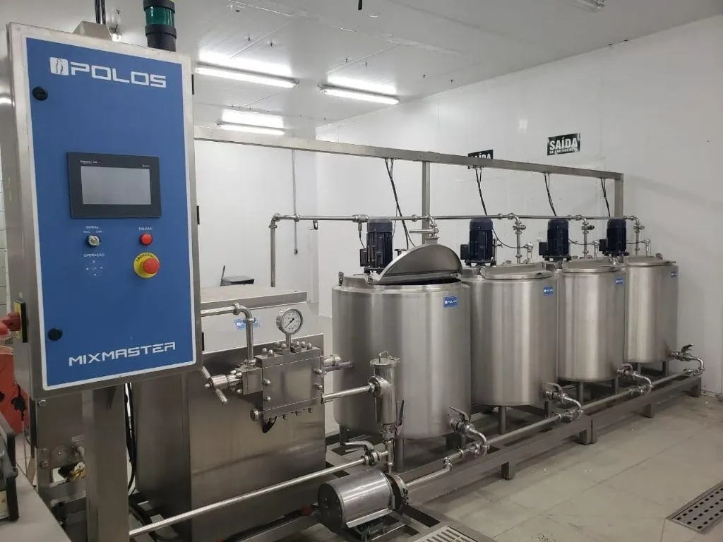 Linha completa para mistura, pasteurização, homogeneização e resfriamento de sorvetes.