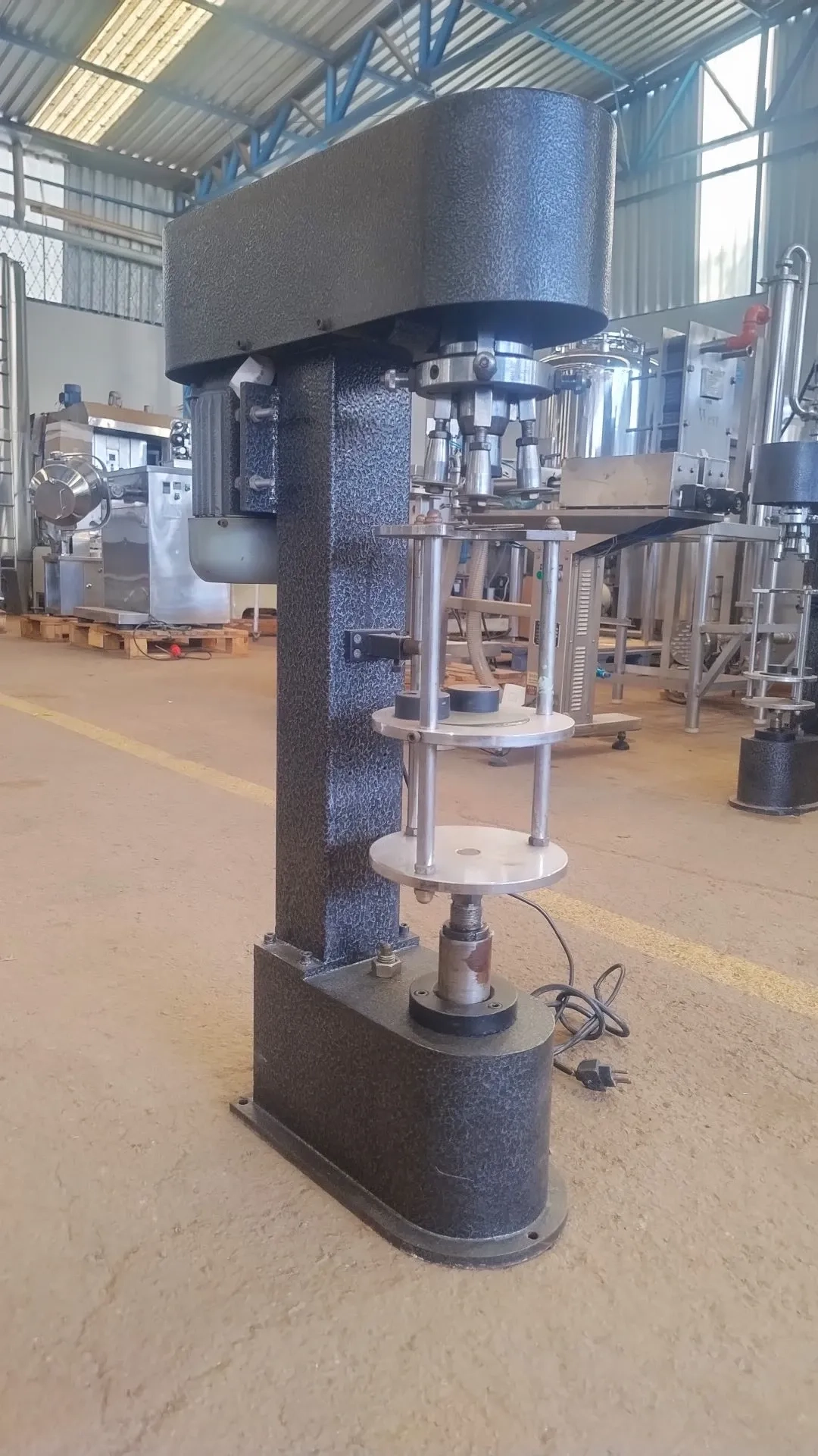 Máquina de fechamento rosqueadeira para tampas em alumínio (tampa pilfer) ou plástico modelo DC-50. Capacidade 800 garrafas/ hora, altura da garrafa 70-330 mm, faixa de fechamento Φ25-35 mm, potência 0,25 kW, voltagem 220 V/60 Hz, peso 55 kg. Duas unidades disponíveis.