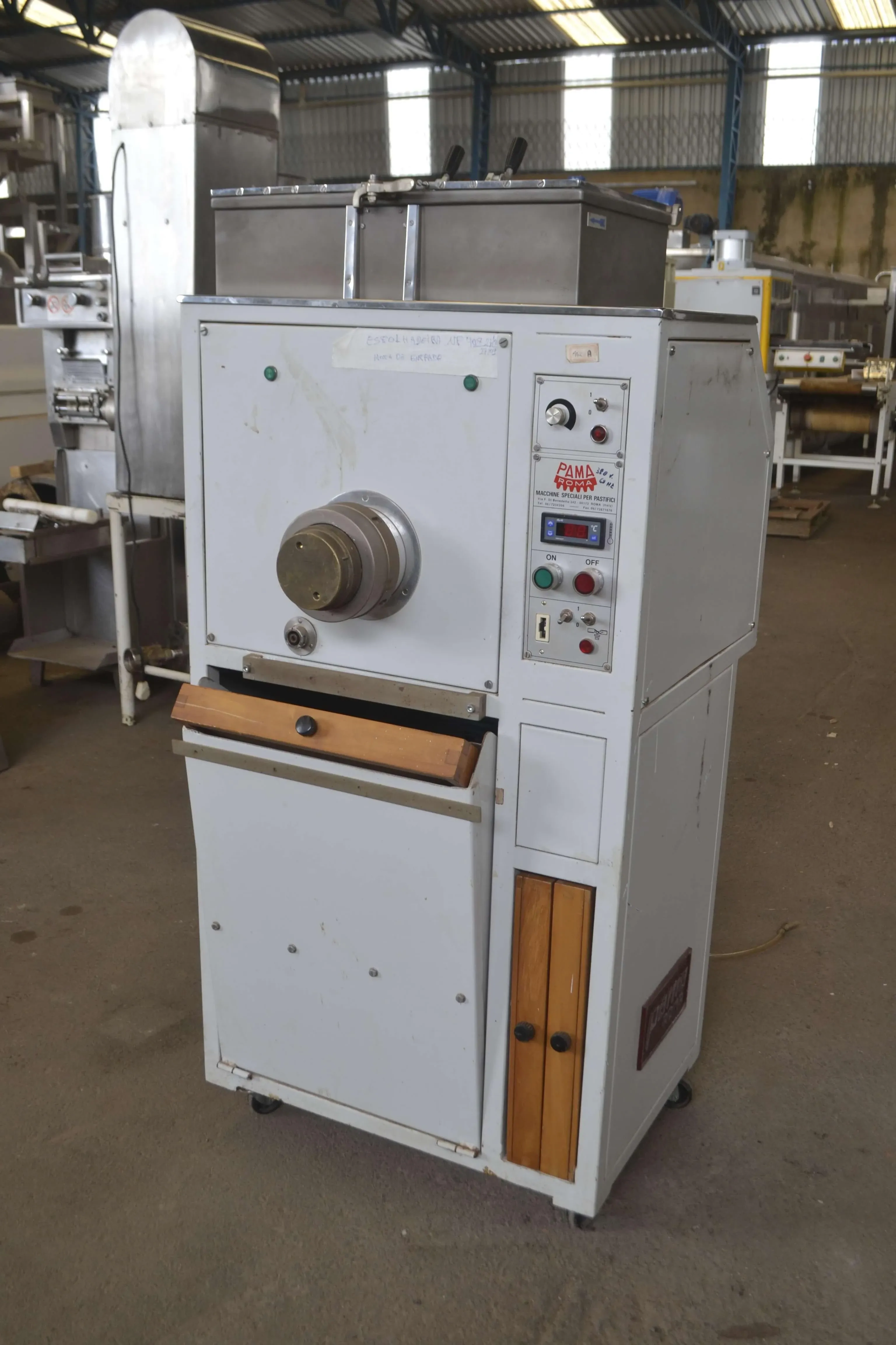 Masseira, esfolhadeira e extrusora de massas capacidade 25 Kg marca Pama Roma. Equipamento para mistura da massa, com esfolhadeira para folhas de 200 mm e extrusora de massas curtas e longas - com cortador. Ideal para atender a restaurantes, rotisserias, hotéis etc. O sistema possui sistema de resfriamento de água, que impede o aquecimento da massa à sua saída. É possível ainda o acoplamento de esteira e enrolador para a automatização do processo da esfolhadeira.