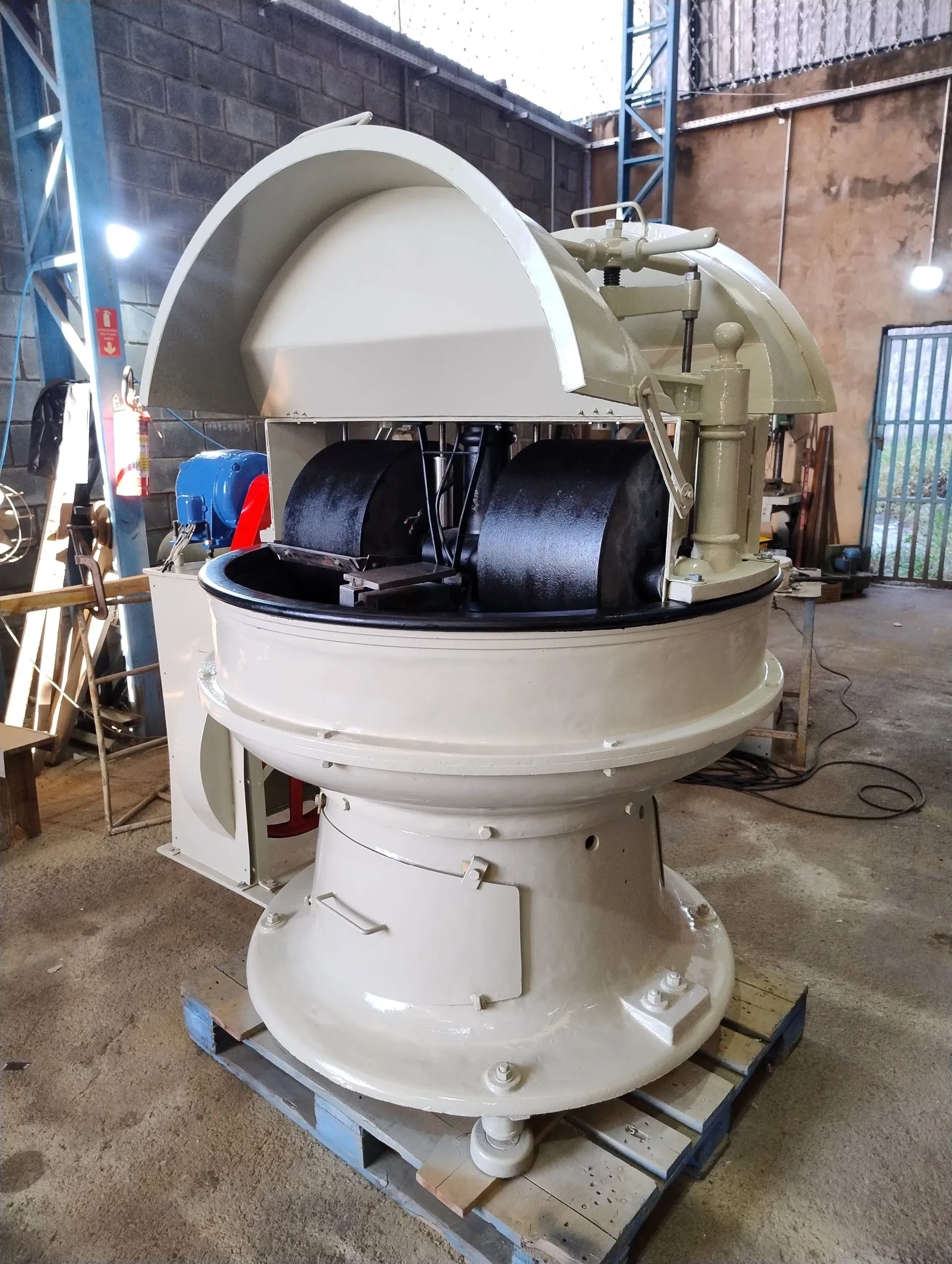 Melangeur capacidade entre 30 e 50 Kg. Equipamento com rolos e fundo em granito e estrutura em ferro fundido. Com tampa bipartida de proteção e resistências para suporte no aquecimento durante o processo de refino. Voltagem 220/ 440 v Trifásico.