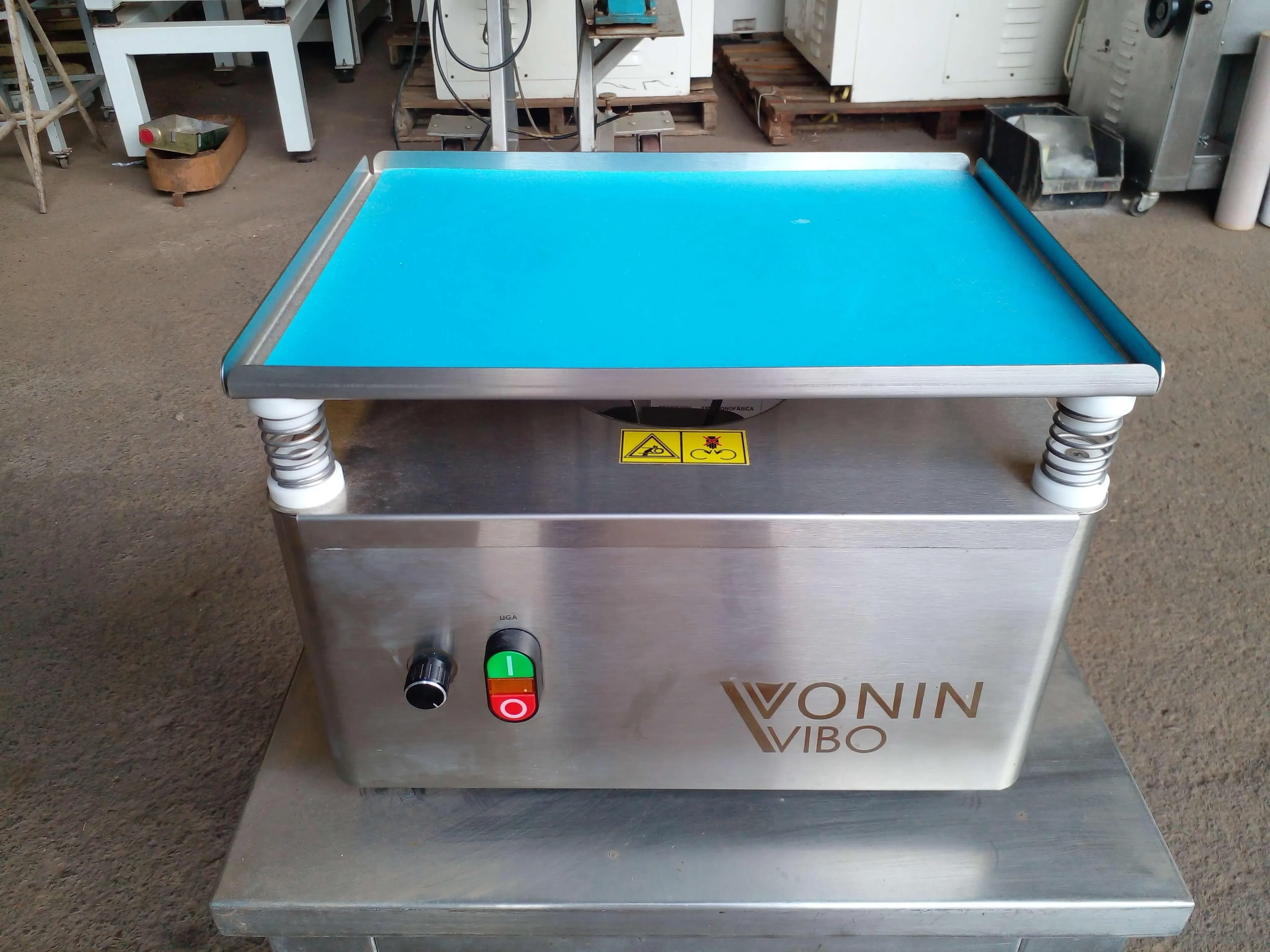 Mesa Vibratória marca Vonin modelo Vibo. É uma mesa vibratória silenciosa e compacta, feita para pequenas produções de chocolates.