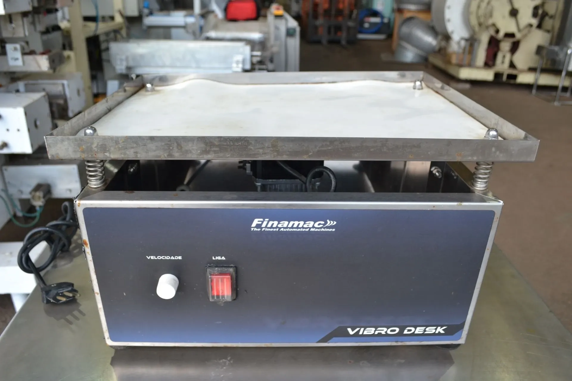 Mesa Vibratória para chocolate marca Finamac modelo Vibro Desk. Equipamento em aço inox, desenvolvido para remover bolhas provenientes do processo de manuseio de chocolate. Possui controlador de velocidade. Manta de silicone na superfície vibratória, proporcionando baixo ruído e longa durabilidade. Voltagem 220 V, monofásico, potência 0,25 kW.