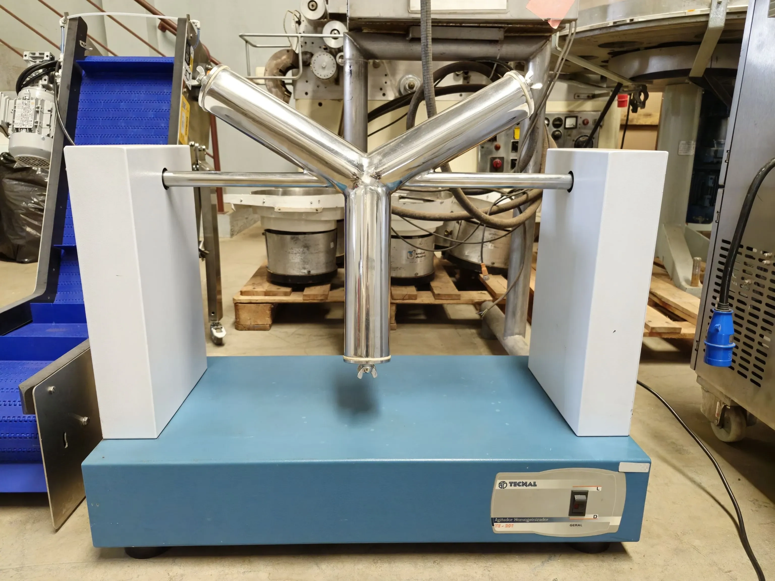 Mini misturador de pós de bancada em Y para laboratório em aço inox 316. Marca Tecnal modelo TE 201. Corpo em aço inox polido, parte interna reagiu para teste de molibdénio, mostrando indicativo de aço inox 316.